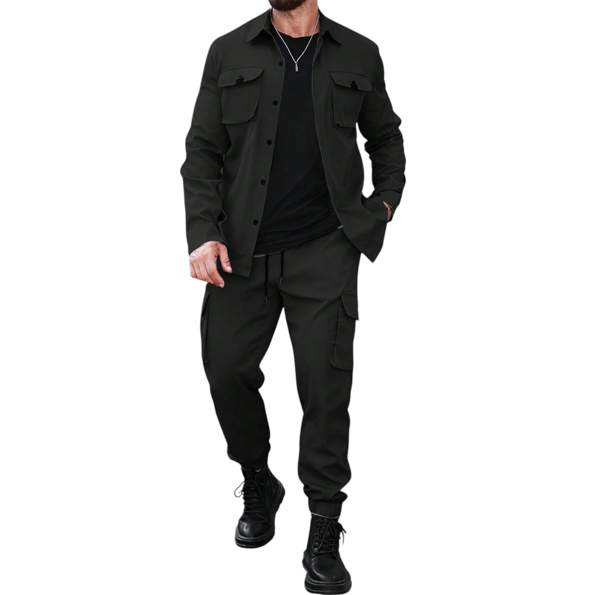 Címke nélküli, fekete, kétrészes szabadidő szett, gombos, zsebes inggel és húzózsinóros derékpántú cargo jogger nadrággal.