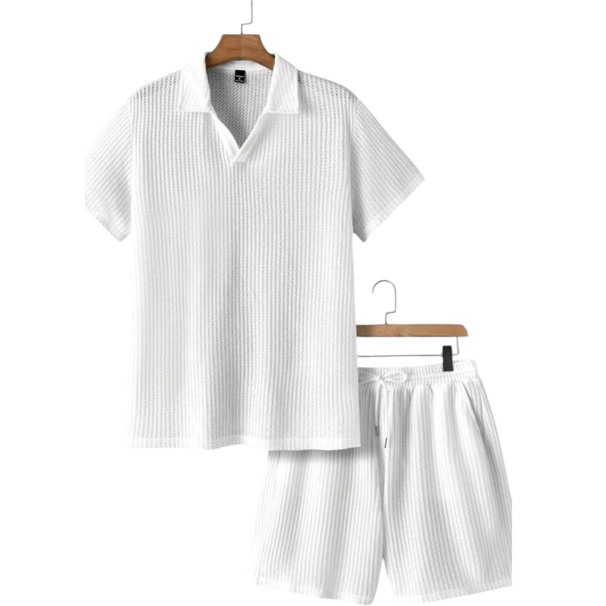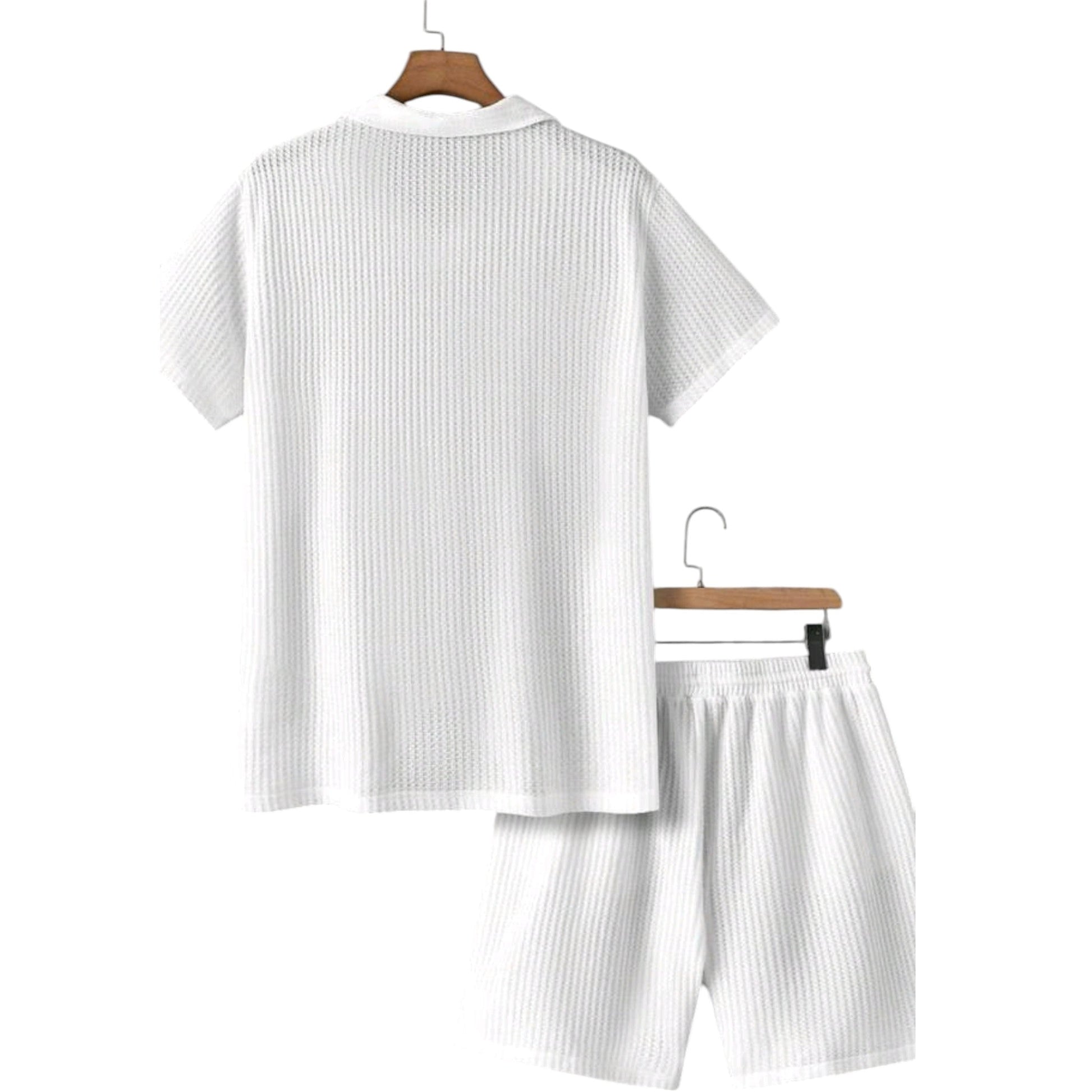 Címke nélküli, fehér, hálós szövésű, rövid ujjú, galléros felső és húzózsinóros derekú rövidnadrág szett.
