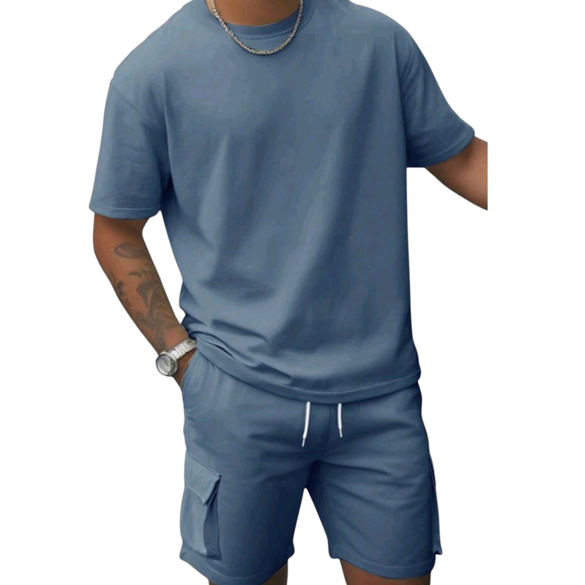 Címke nélküli, kék, rövid ujjú póló, rövidnadrág oldalsó zsebekkel, húzózsinóros derékkal.