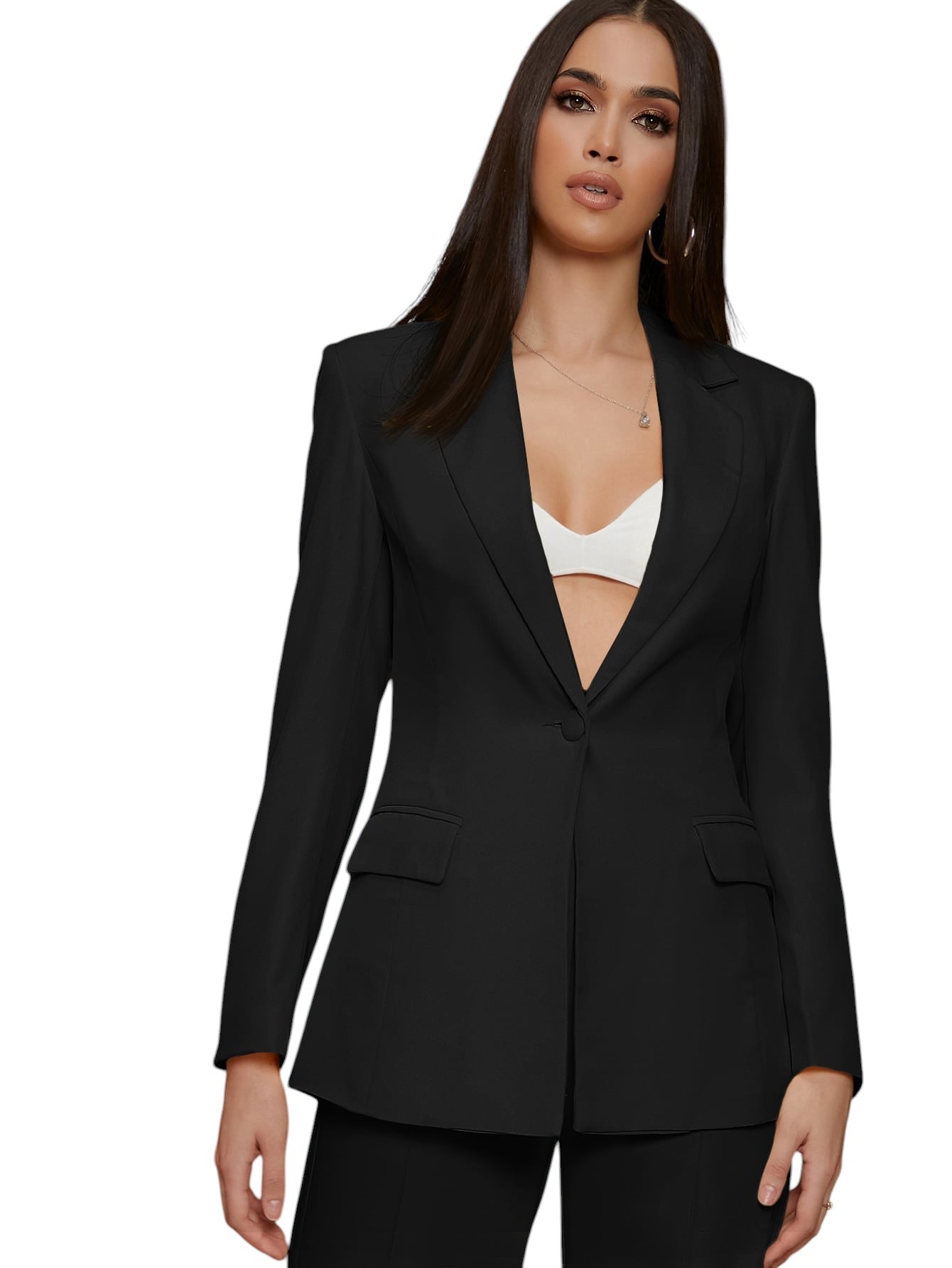 Címke nélküli, fekete, hajtókás galléros, egysoros gombolású blézer