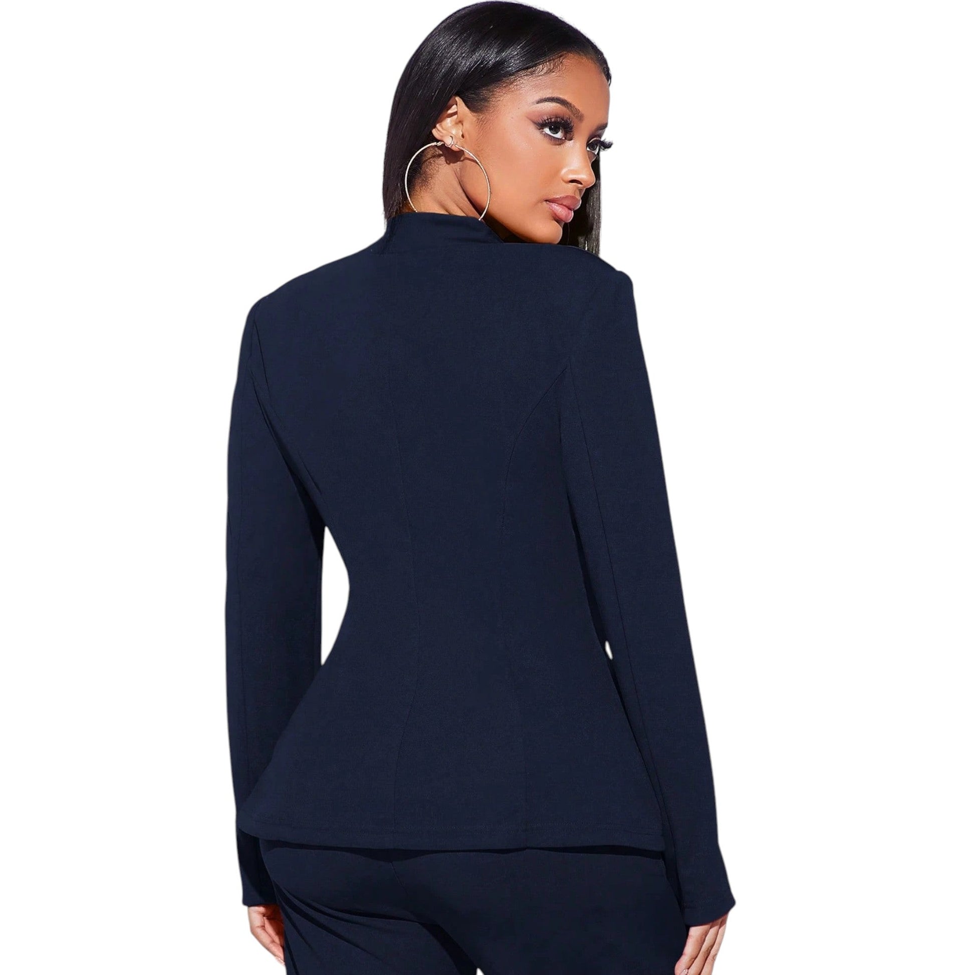Címke nélküli, sötétkék, hosszú ujjú egysoros blézer kihajtós gallérral és elöl gombos záródással, két álzsebbel.