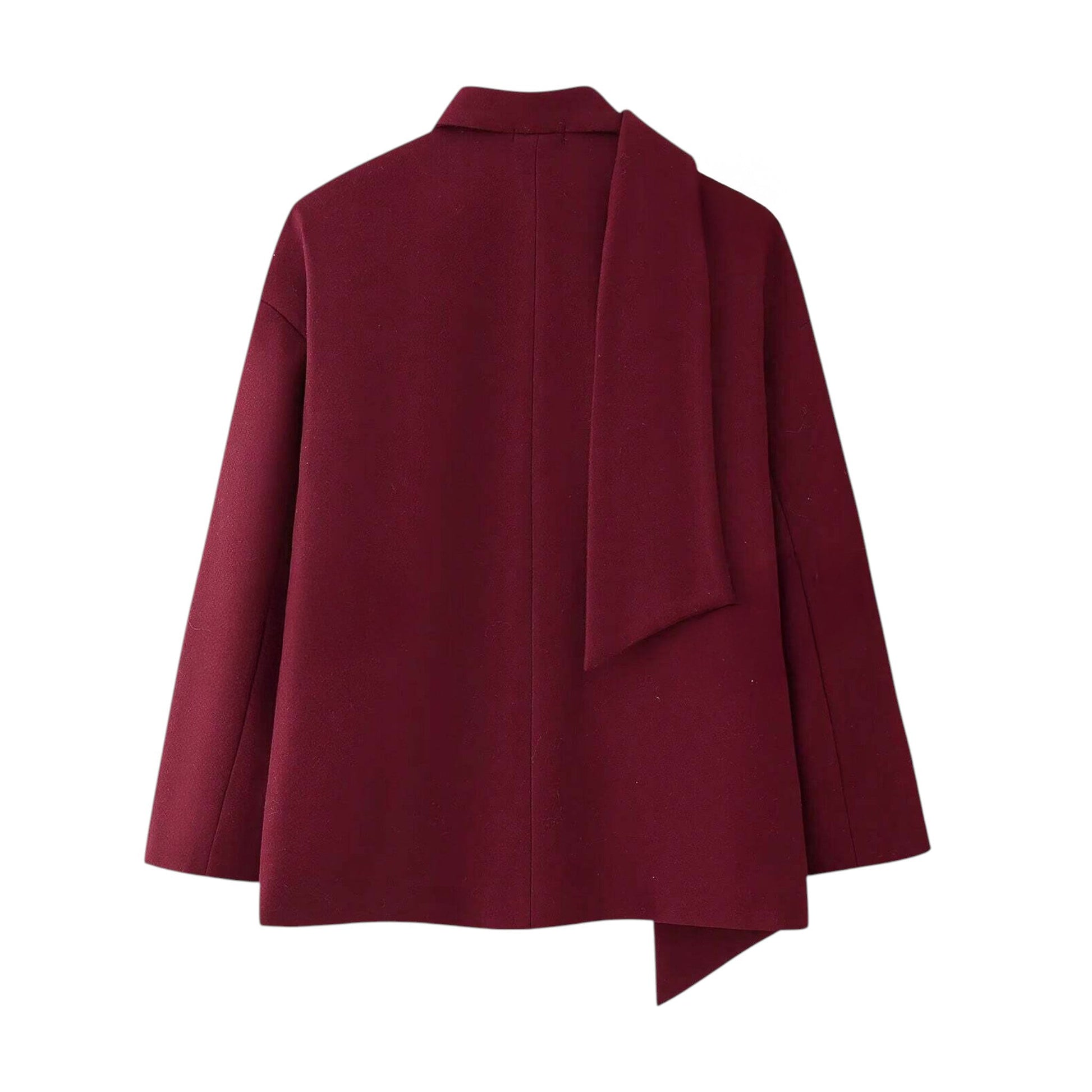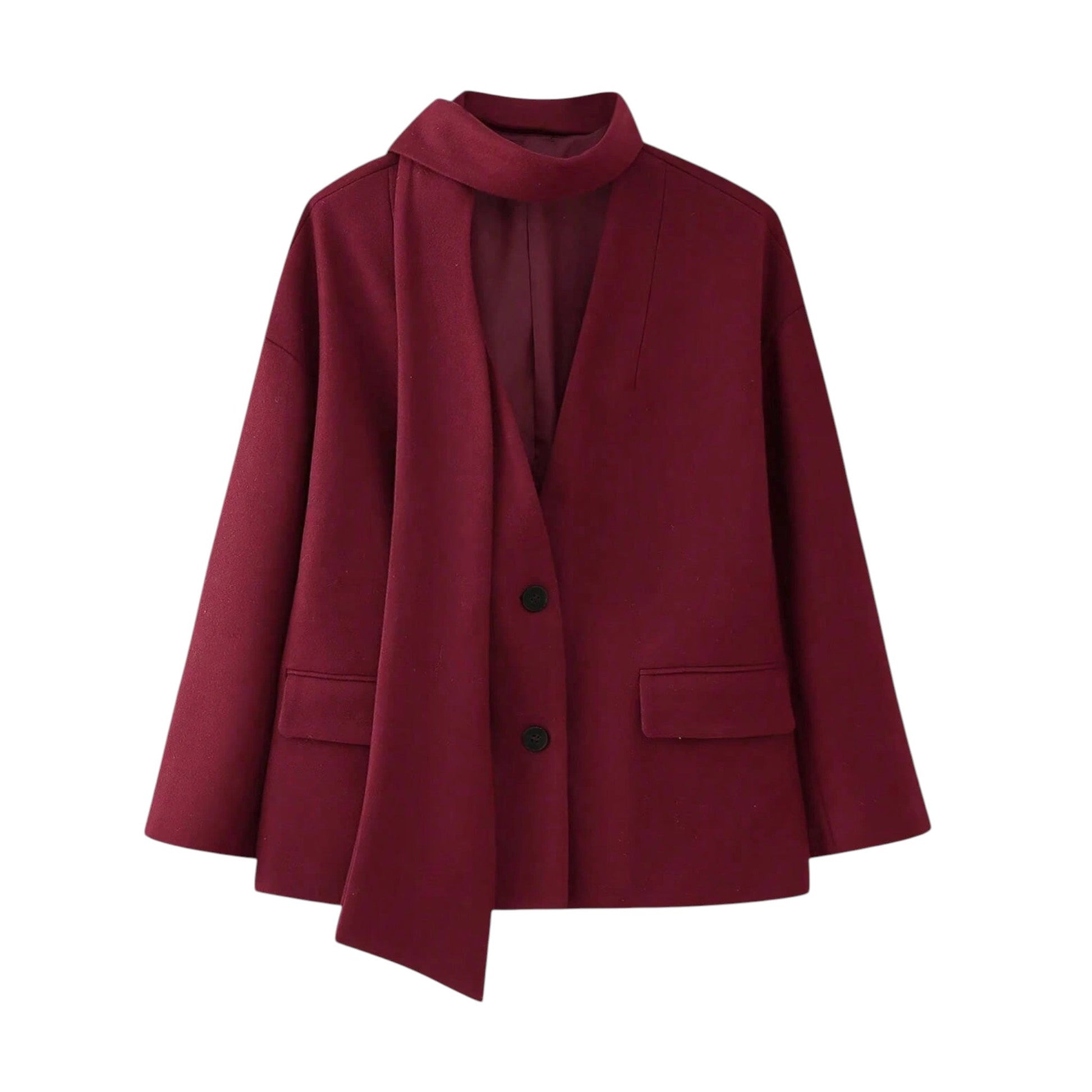 Címke nélküli, bordó, V-nyakú, hosszú ujjú kabát, két gombbal és egy rávarrt sállal.