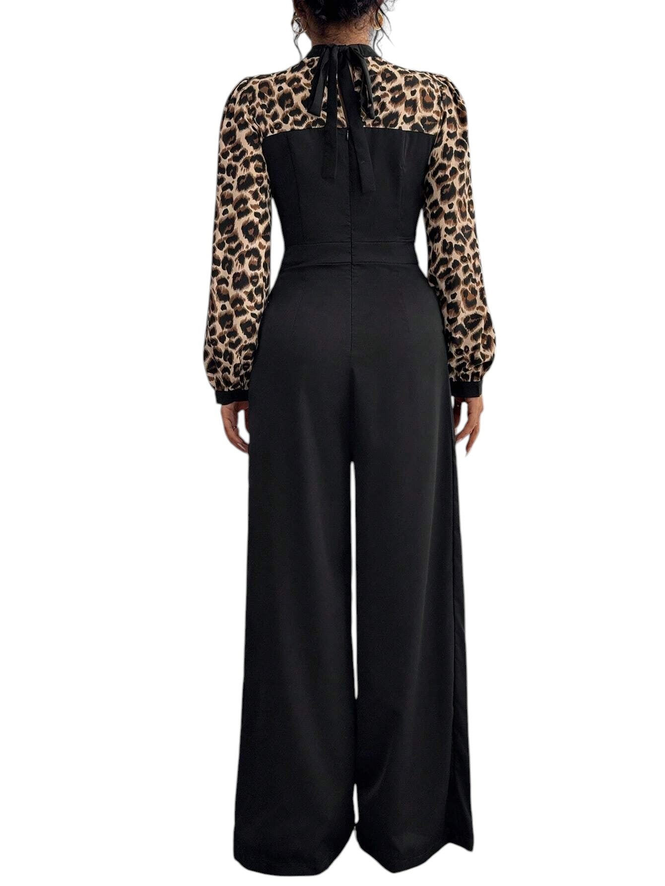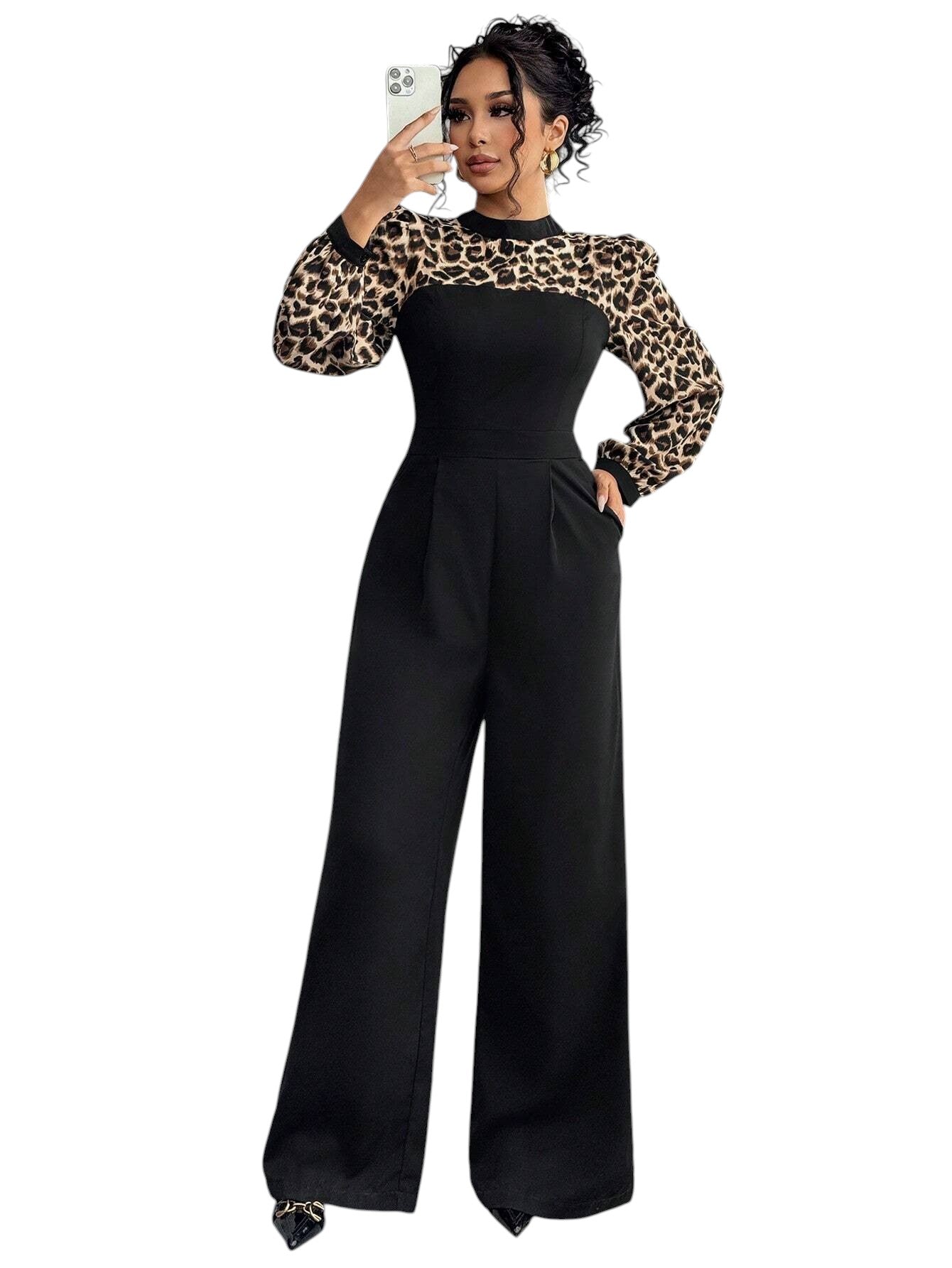 Címke nélküli, fekete alapon leopárdmintás hosszú ujjú, magas nyakú, bő szárú overall