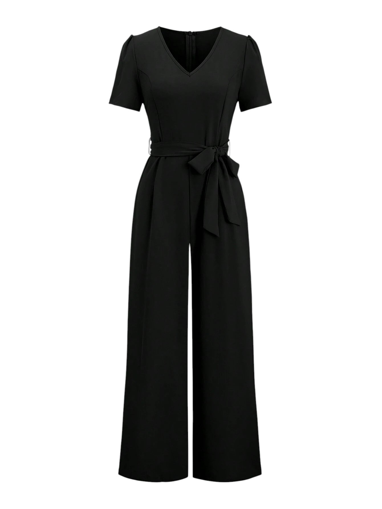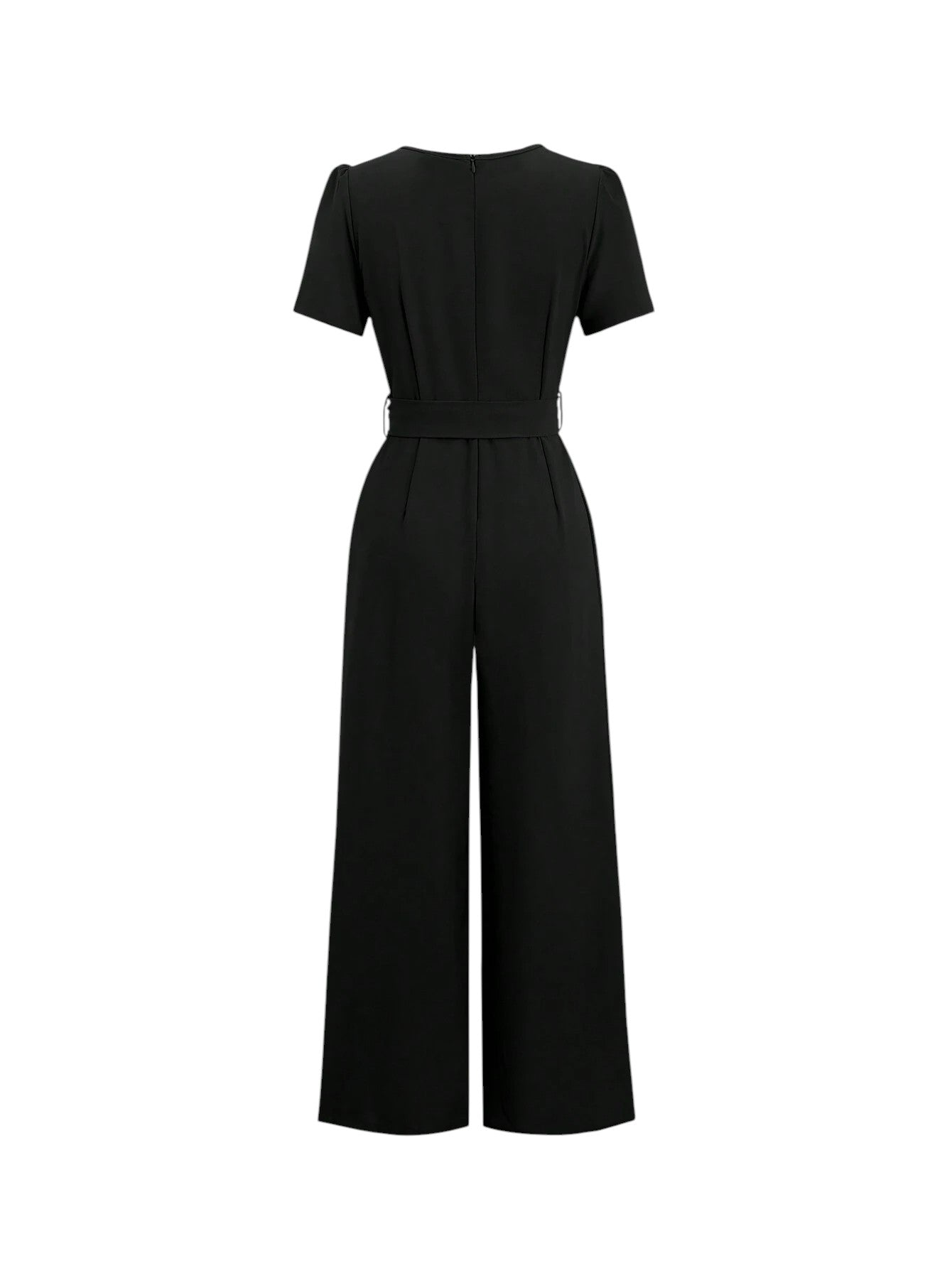 Címke nélküli, fekete, V-nyakú, rövid ujjú, bő szárú jumpsuit megkötős övvel