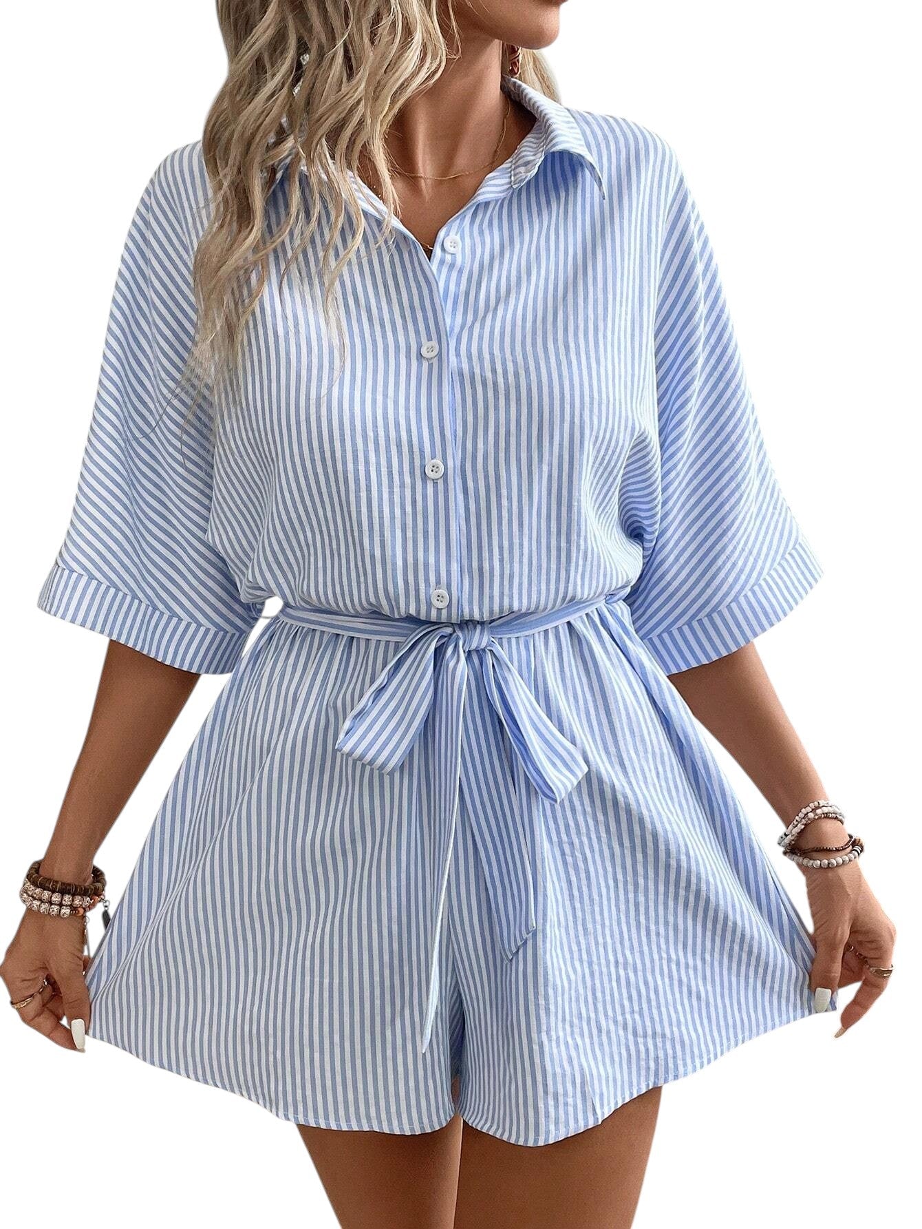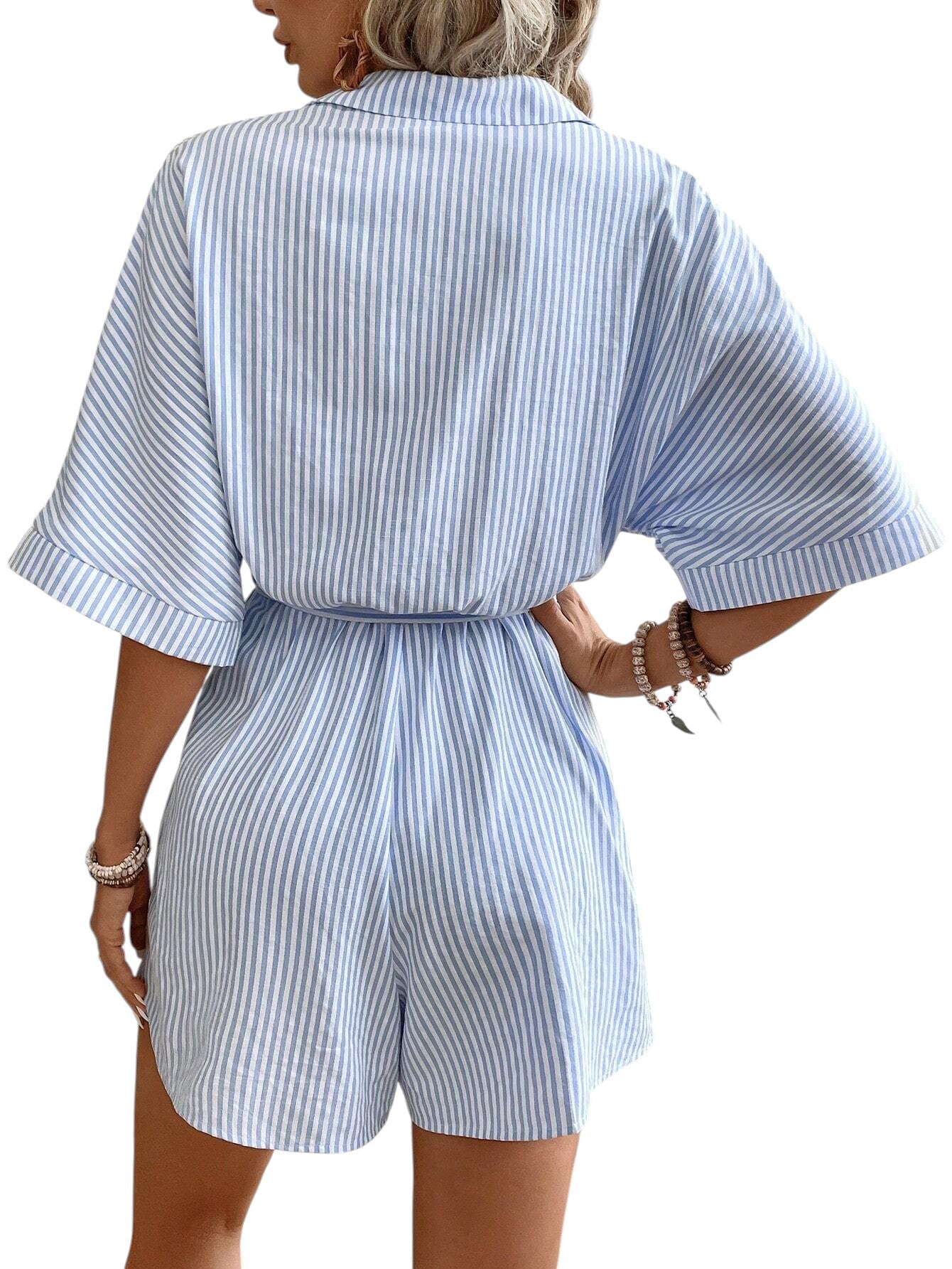 Címke nélküli, világoskék és fehér csíkos, galléros, rövid ujjú, gombos playsuit megkötős övvel