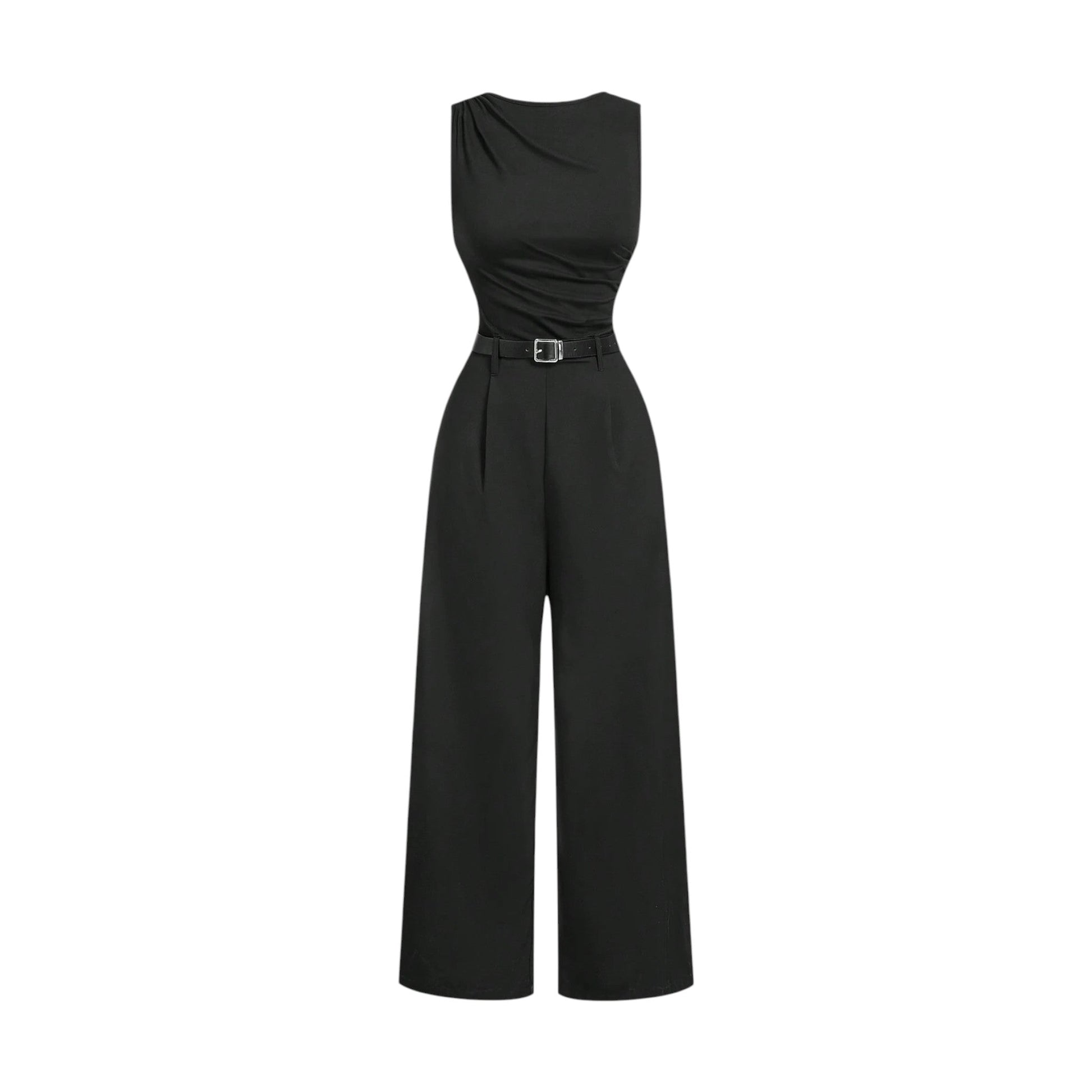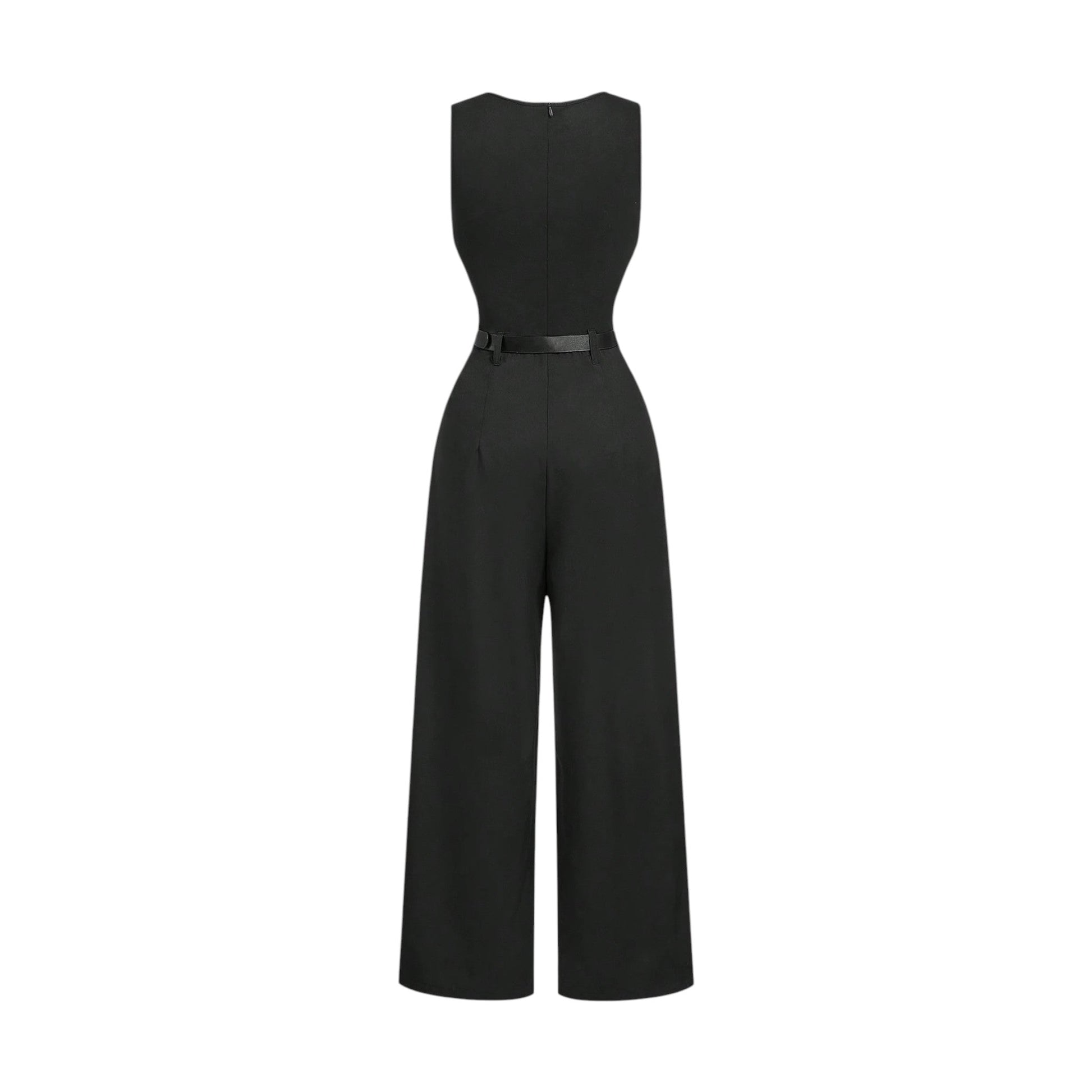 Címke nélküli, fekete, ujjatlan, kerek nyakú, öves, bő szárú jumpsuit.