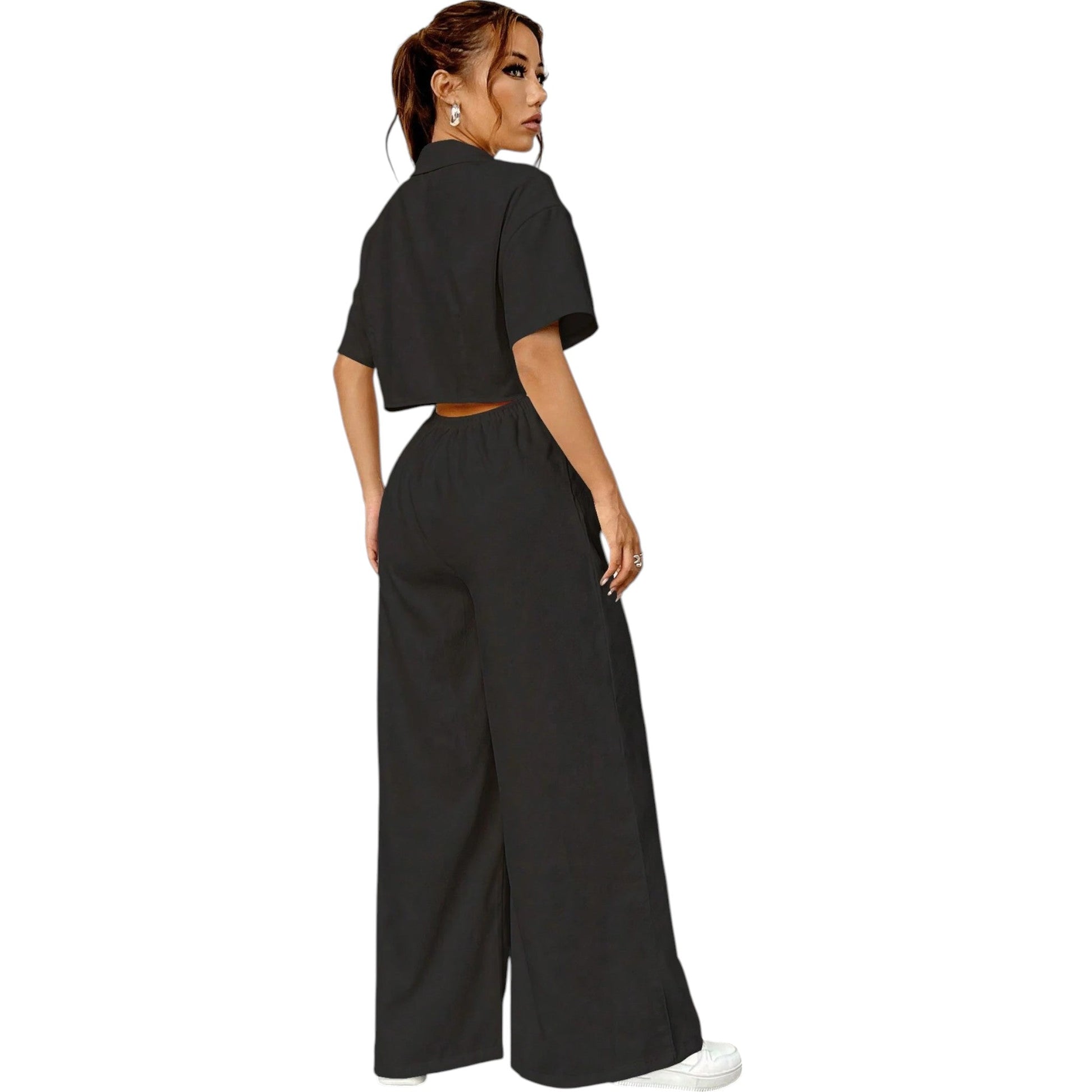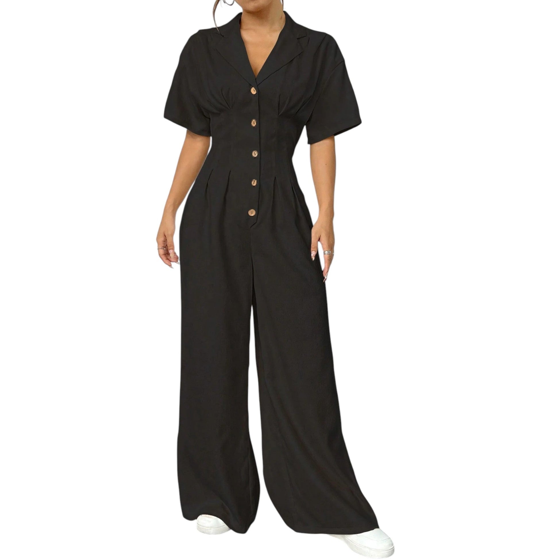 Címke nélküli, fekete, rövid ujjú, galléros, gombos, bő szárú jumpsuit, karcsúsított derékkal.