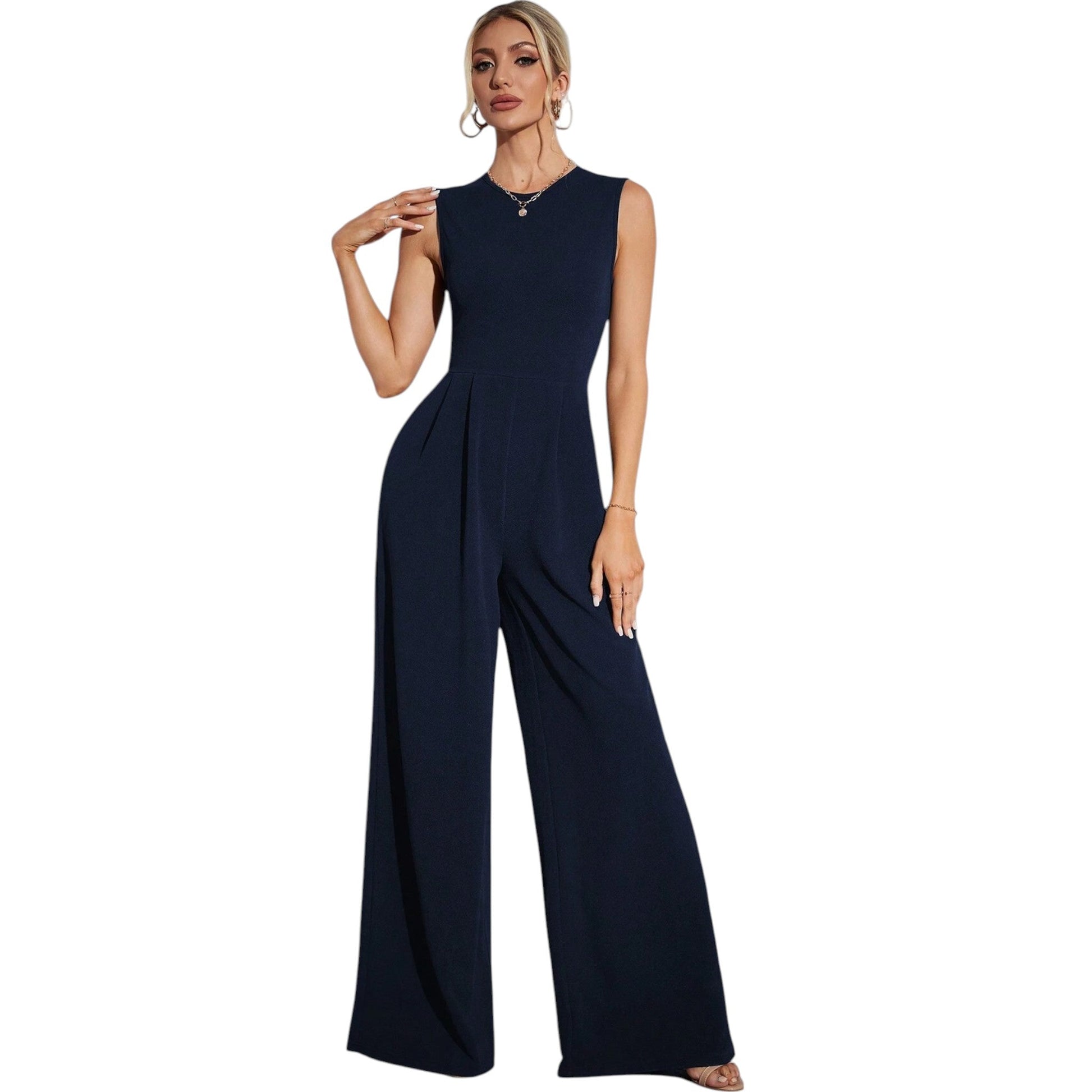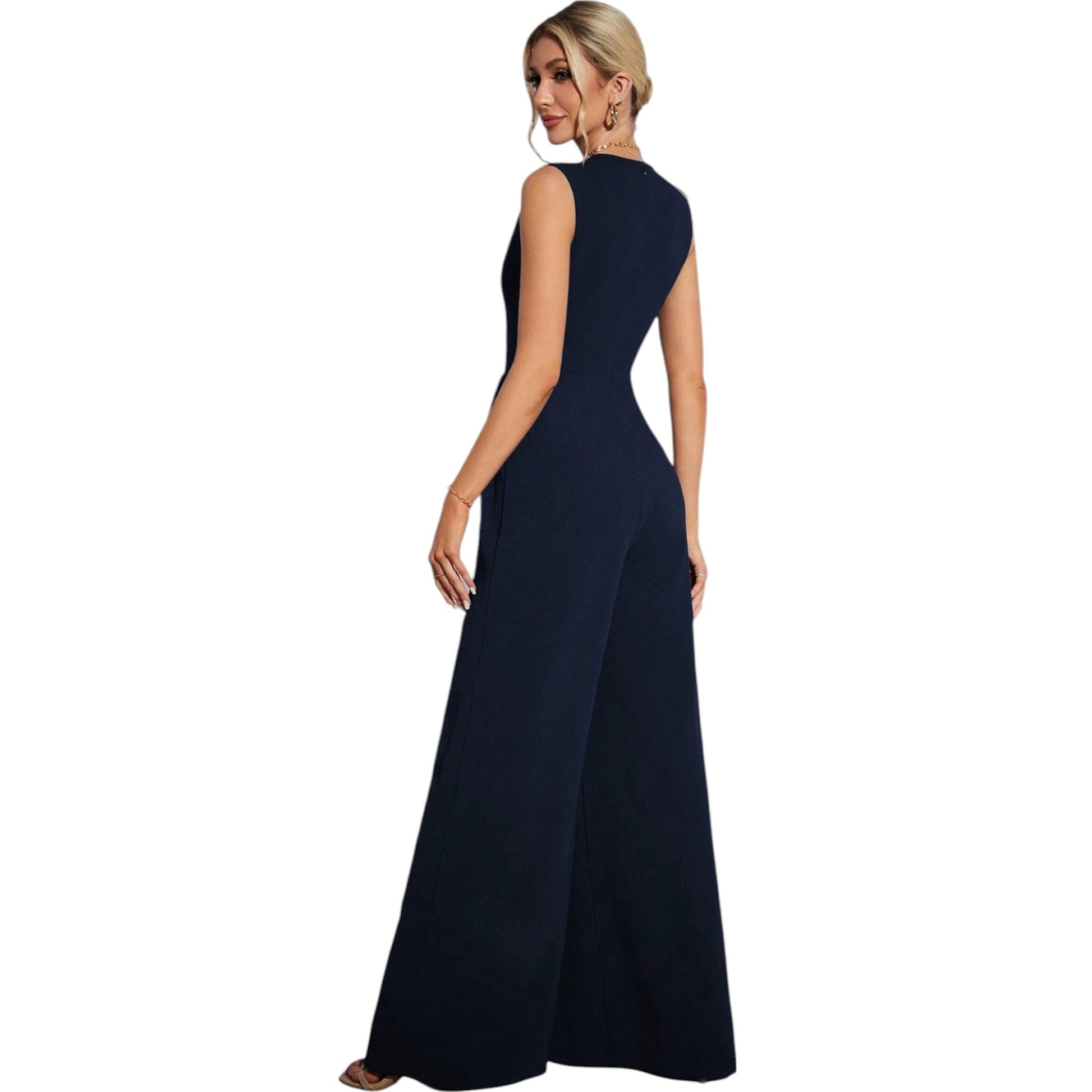 Címke nélküli, sötétkék, ujjatlan, V-nyakú, bő szárú overál.