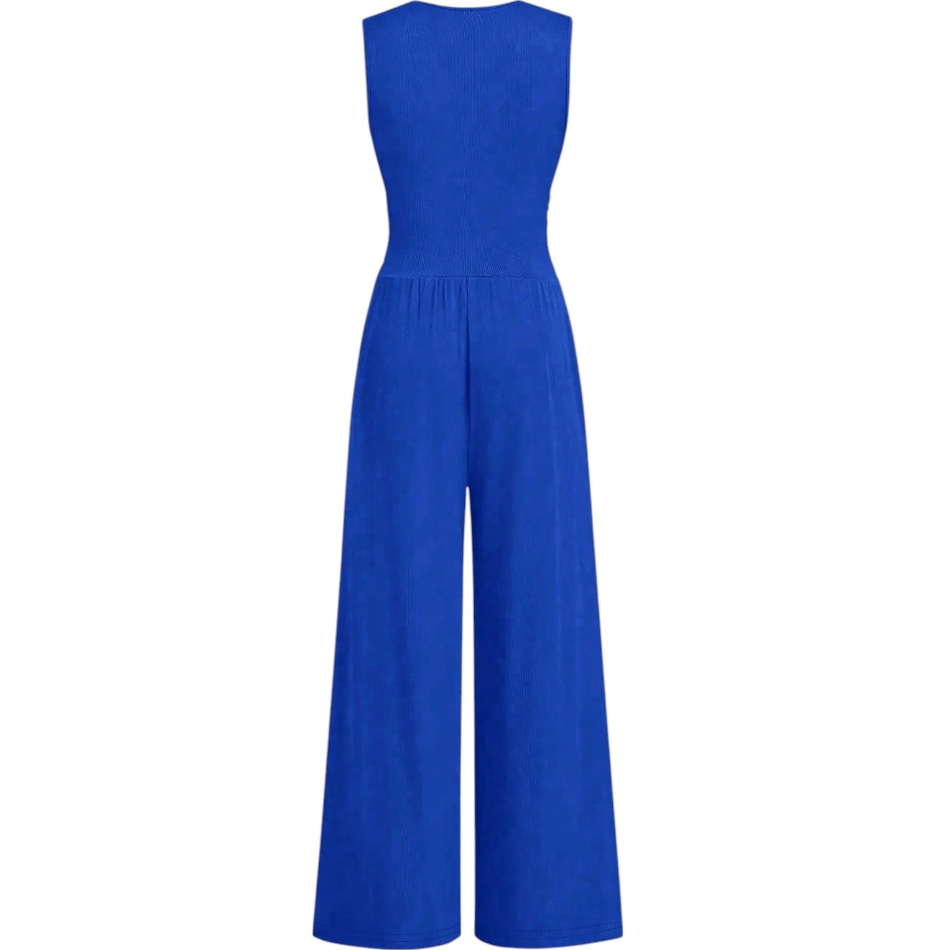 Címke nélküli, kék, ujjatlan, V-nyakú, deréknál húzott, bő szárú, hosszú overál.