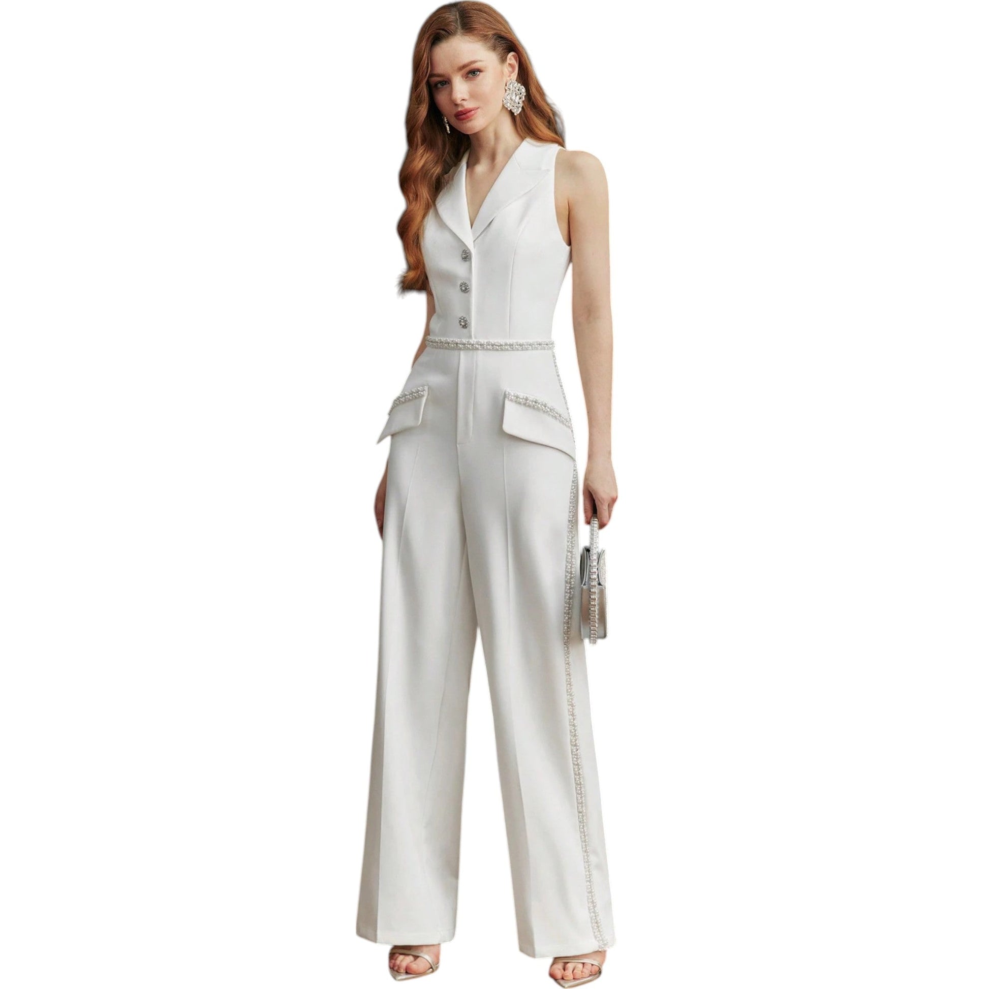 Címke nélküli, fehér, ujjatlan overál, galléros, elől gombos, széles szárú, zsebekkel, strasszköves díszítéssel.