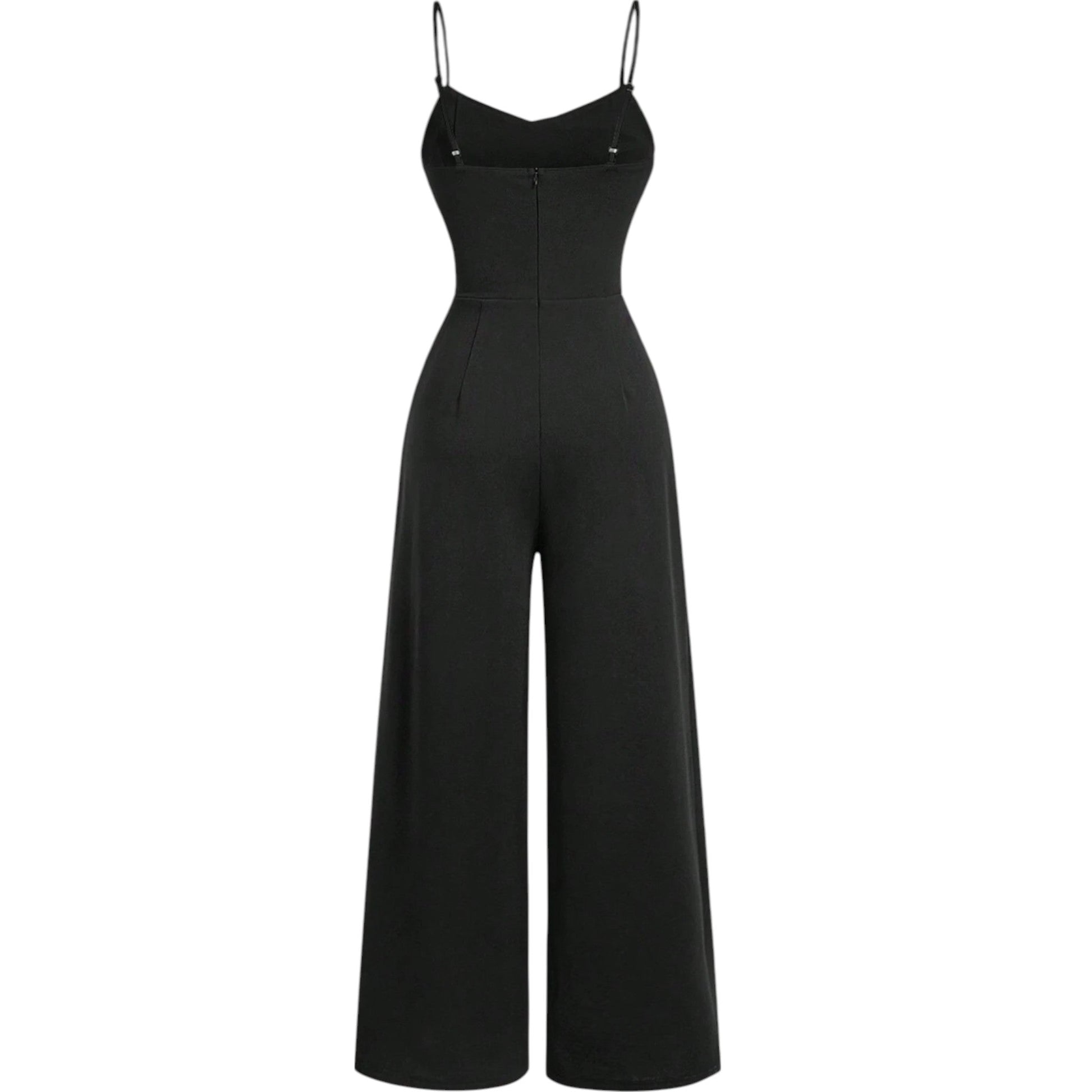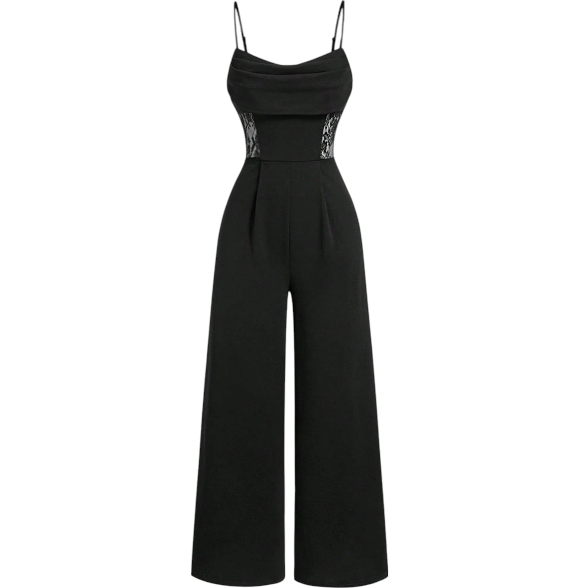 Címke nélküli, fekete, vékony pántos, széles szárú jumpsuit, fodros dekoltázzsal, csipke betéttel a deréknál, hosszú nadrágrésszel.
