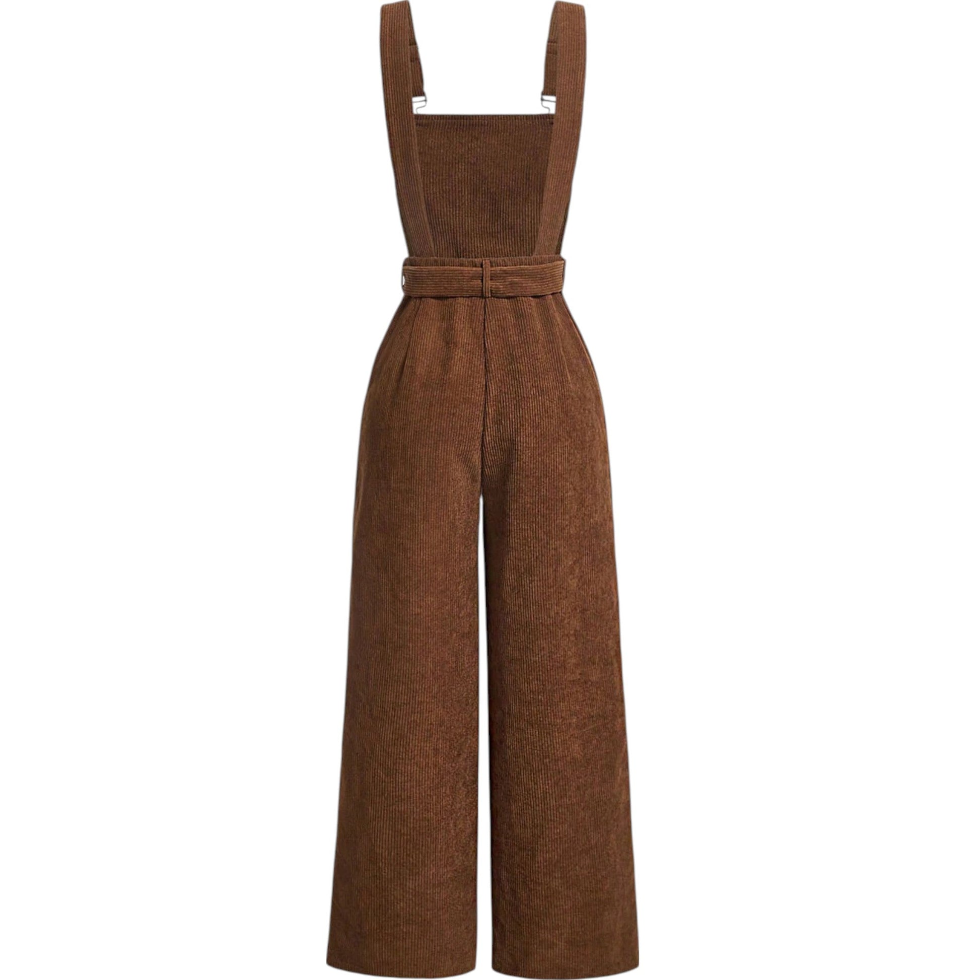 Címke nélküli, barna, corduroy anyagú kantáros nadrág. Egyenes szárú, övtartós, levehető övvel. Elöl fém csatokkal és gombokkal.