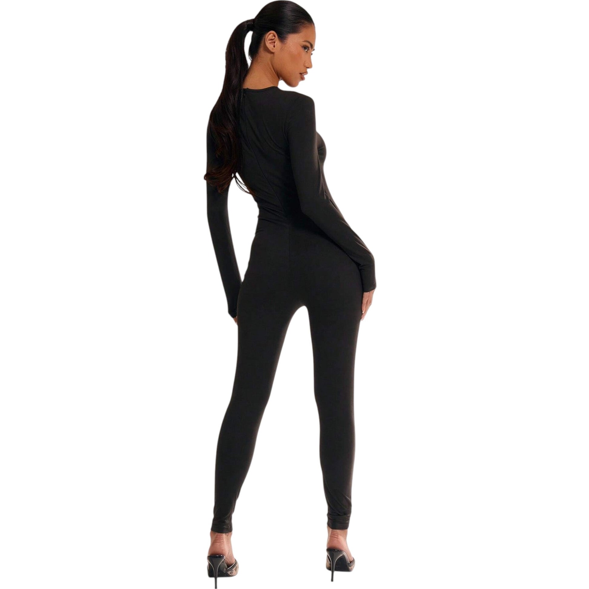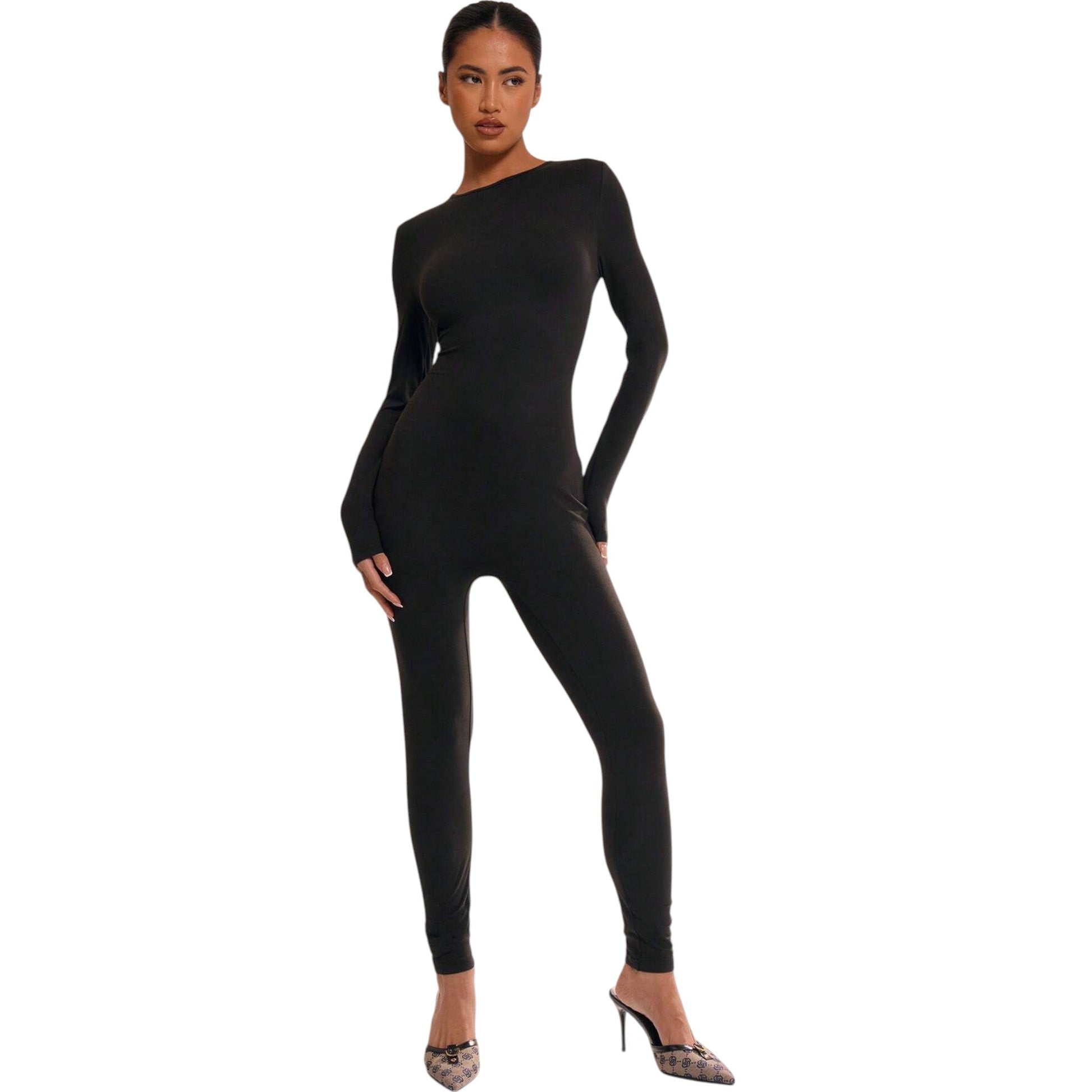 Címke nélküli, fekete, hosszú ujjú, kerek nyakú, testhezálló, hosszú szárú jumpsuit.