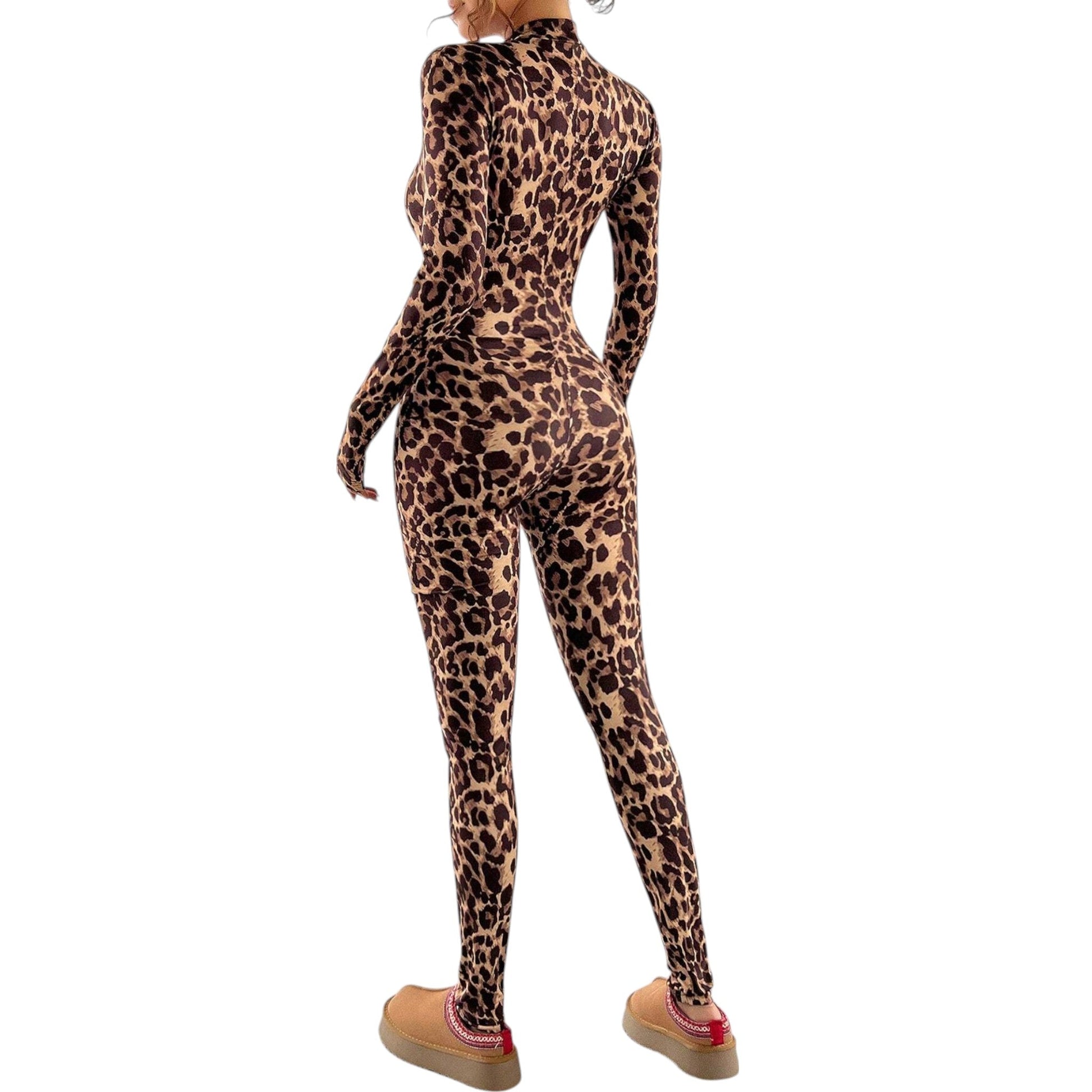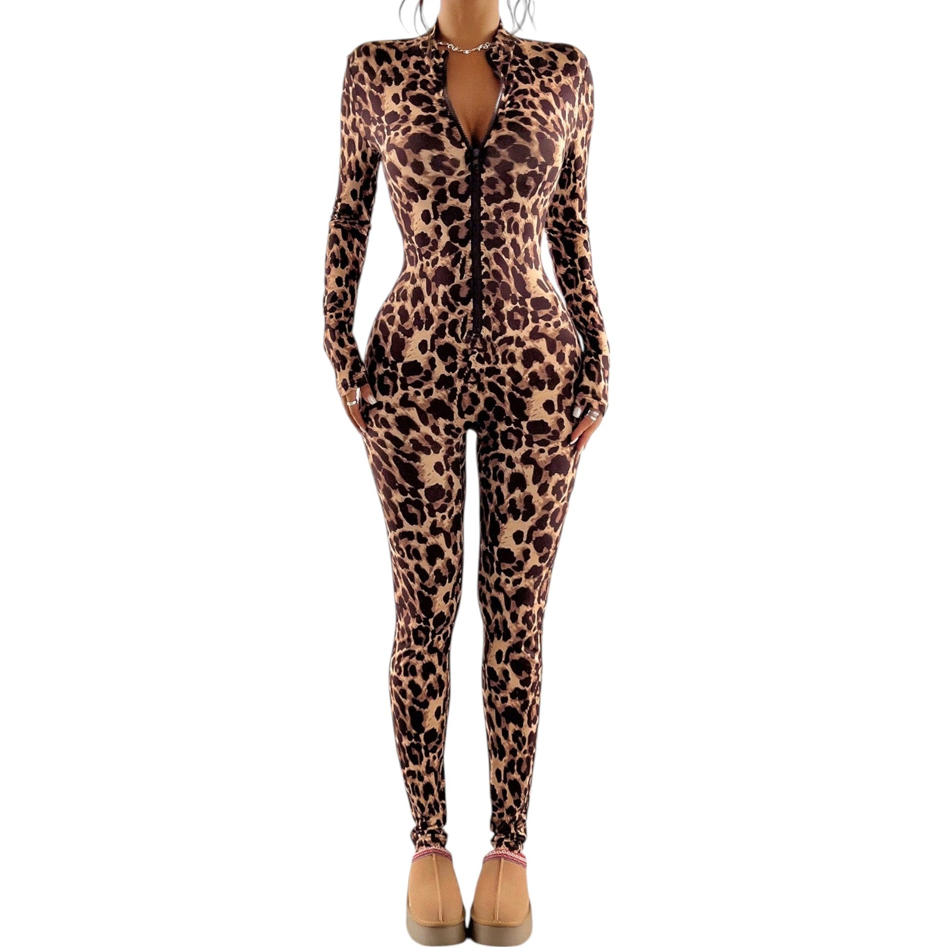 Címke nélküli, barna, fekete leopárdmintás, hosszú ujjú, cipzáras, testhezálló, hosszú szárú jumpsuit.