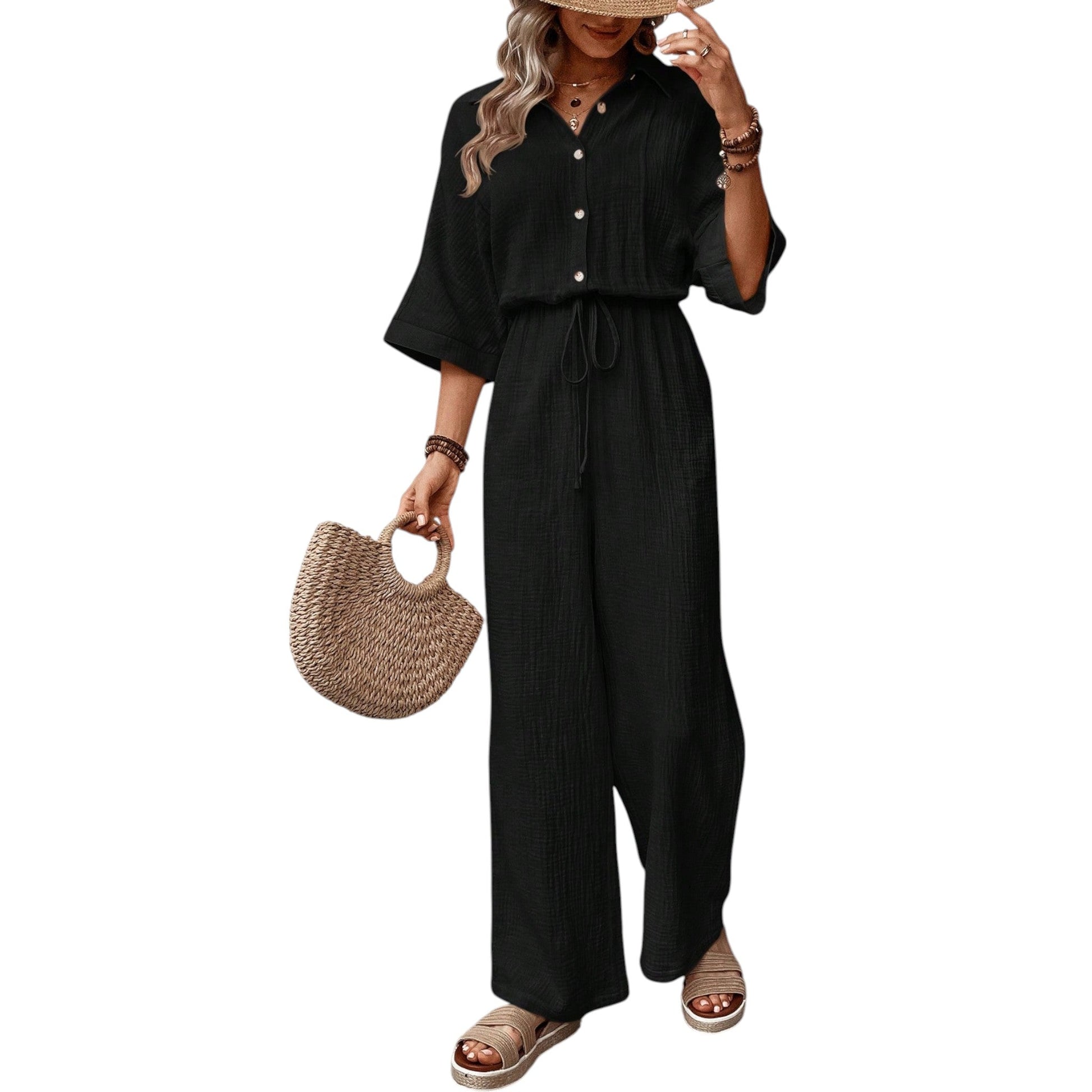 Címke nélküli, fekete, rövid ujjú, galléros, gombos, megkötős derekú, bő szárú overall.