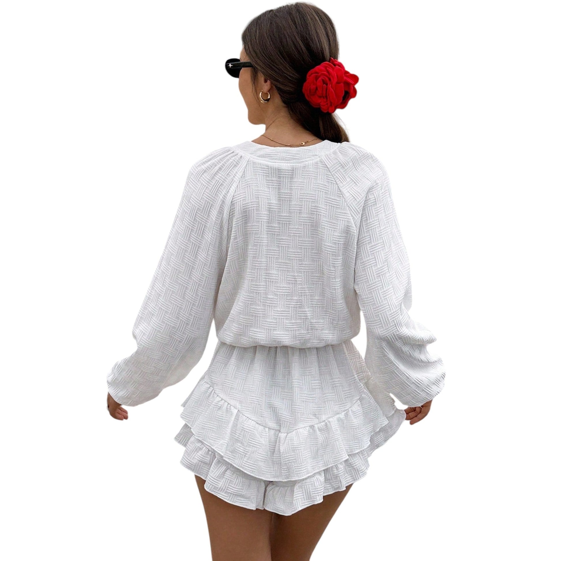 Címke nélküli, fehér, hosszú ujjú, rövid overál, mintás anyagból, V-nyakkal, gombolással és fodros rövidnadrággal.