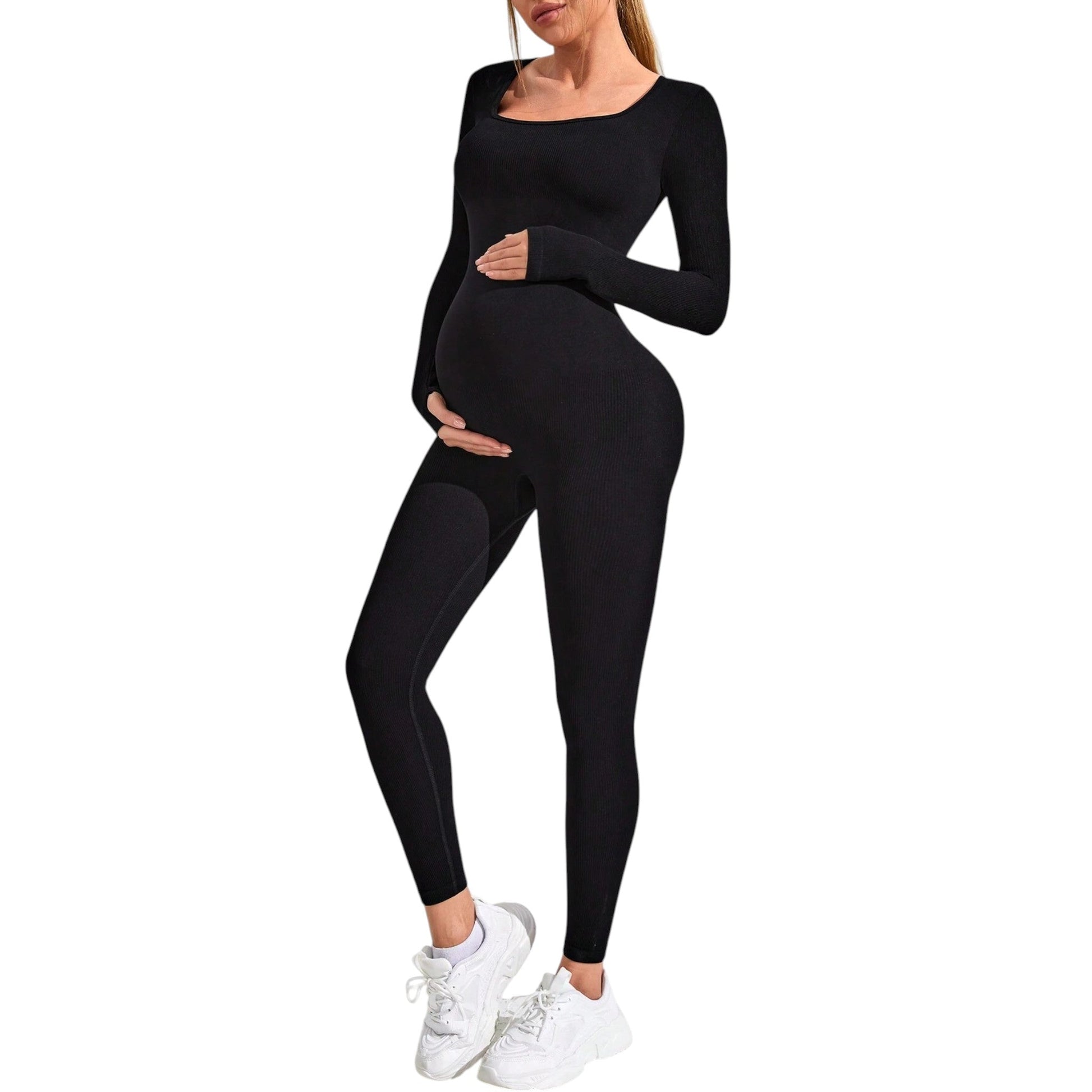 Címke nélküli, fekete, bordázott anyagú, hosszú ujjú, négyzetes nyakkivágású, slim fit, hosszú szárú jumpsuit. Ideális kismamáknak.