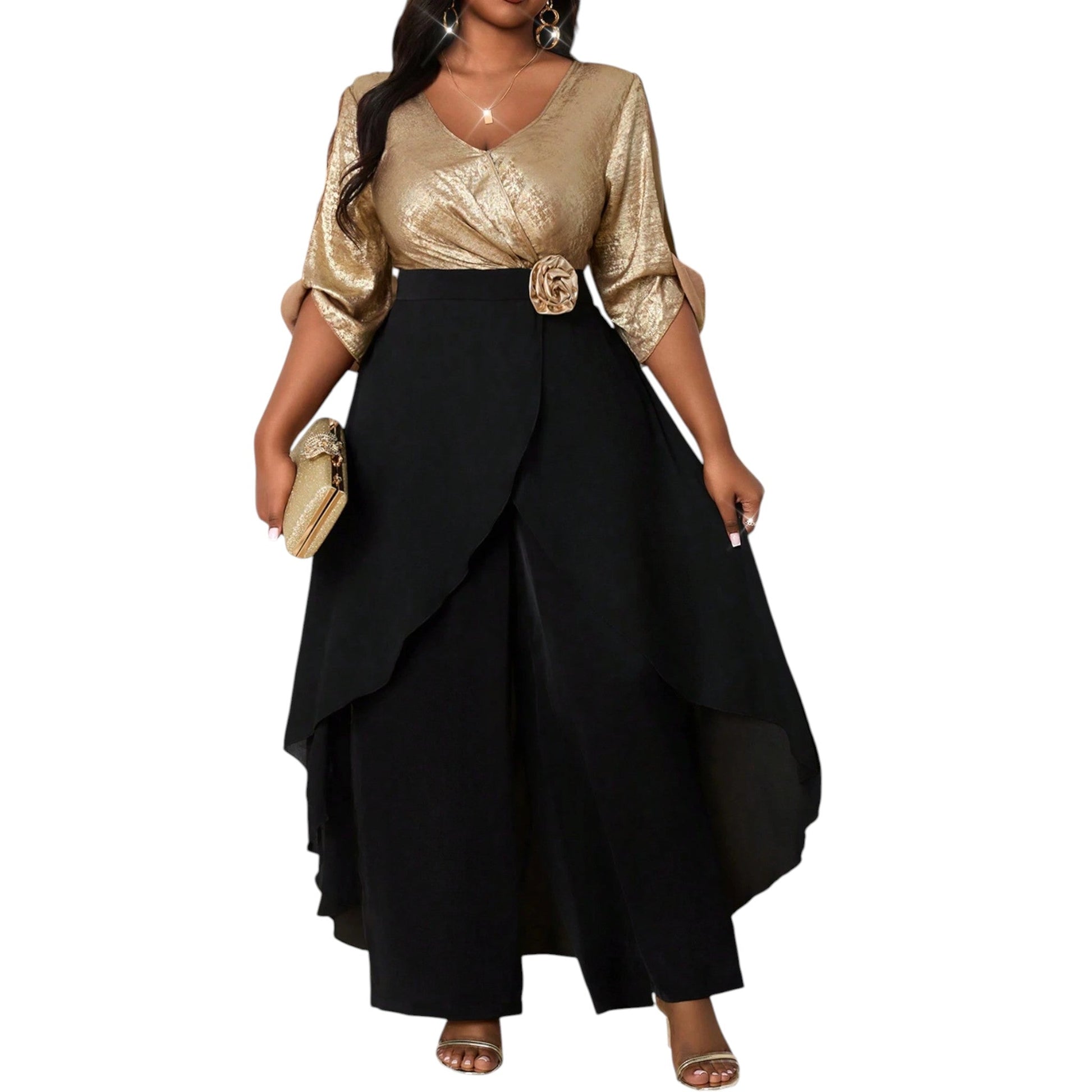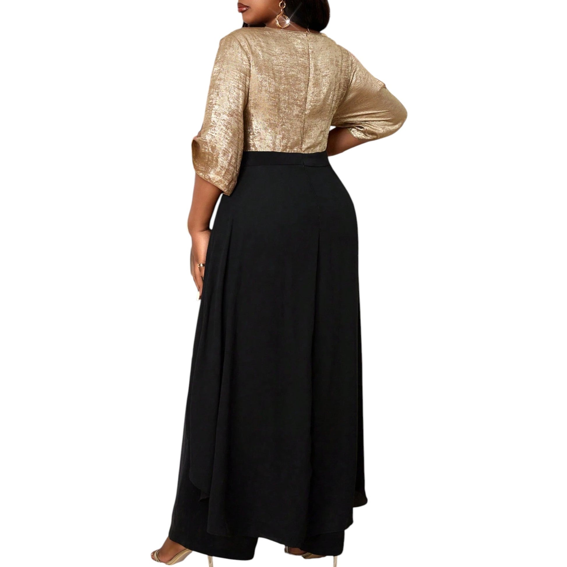 Címke nélküli, arany és fekete, V-nyakú, rövid ujjú, arany színű csillogó felsőrész, fekete alsórész, magasított derék, aszimmetrikus szabású szoknya rész, elől átlapolt dizájn.
