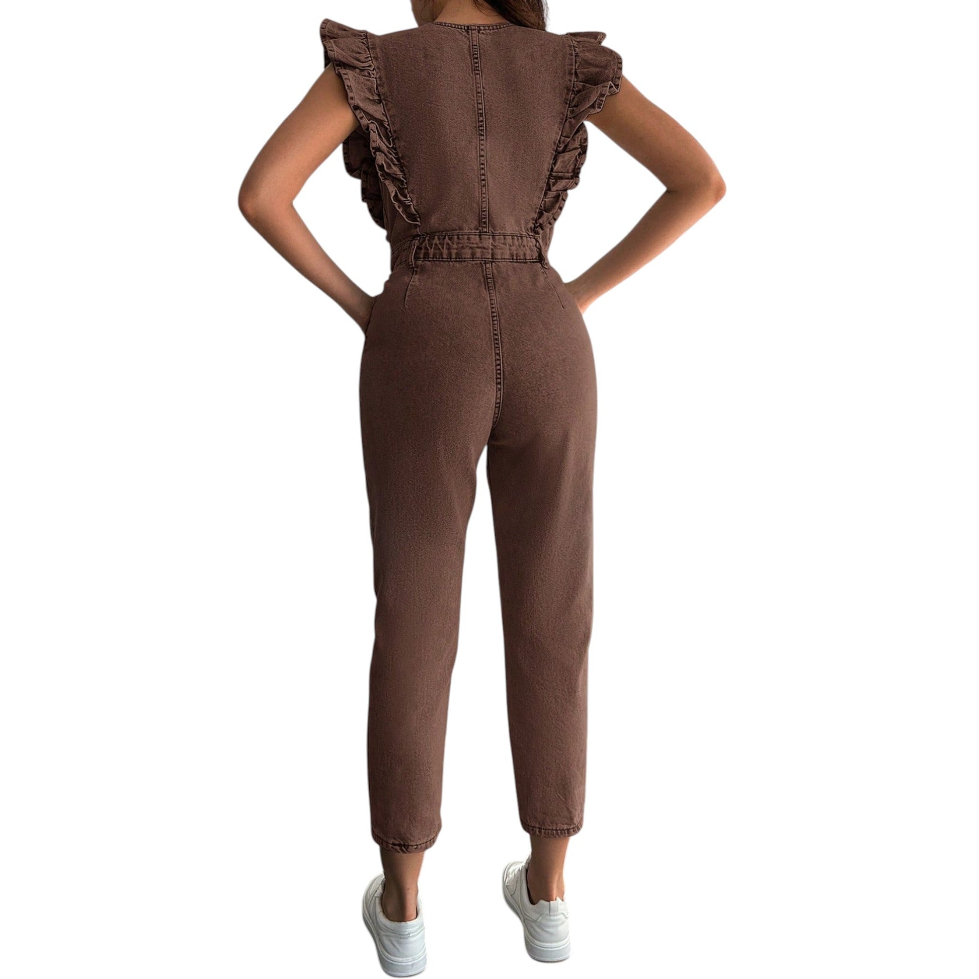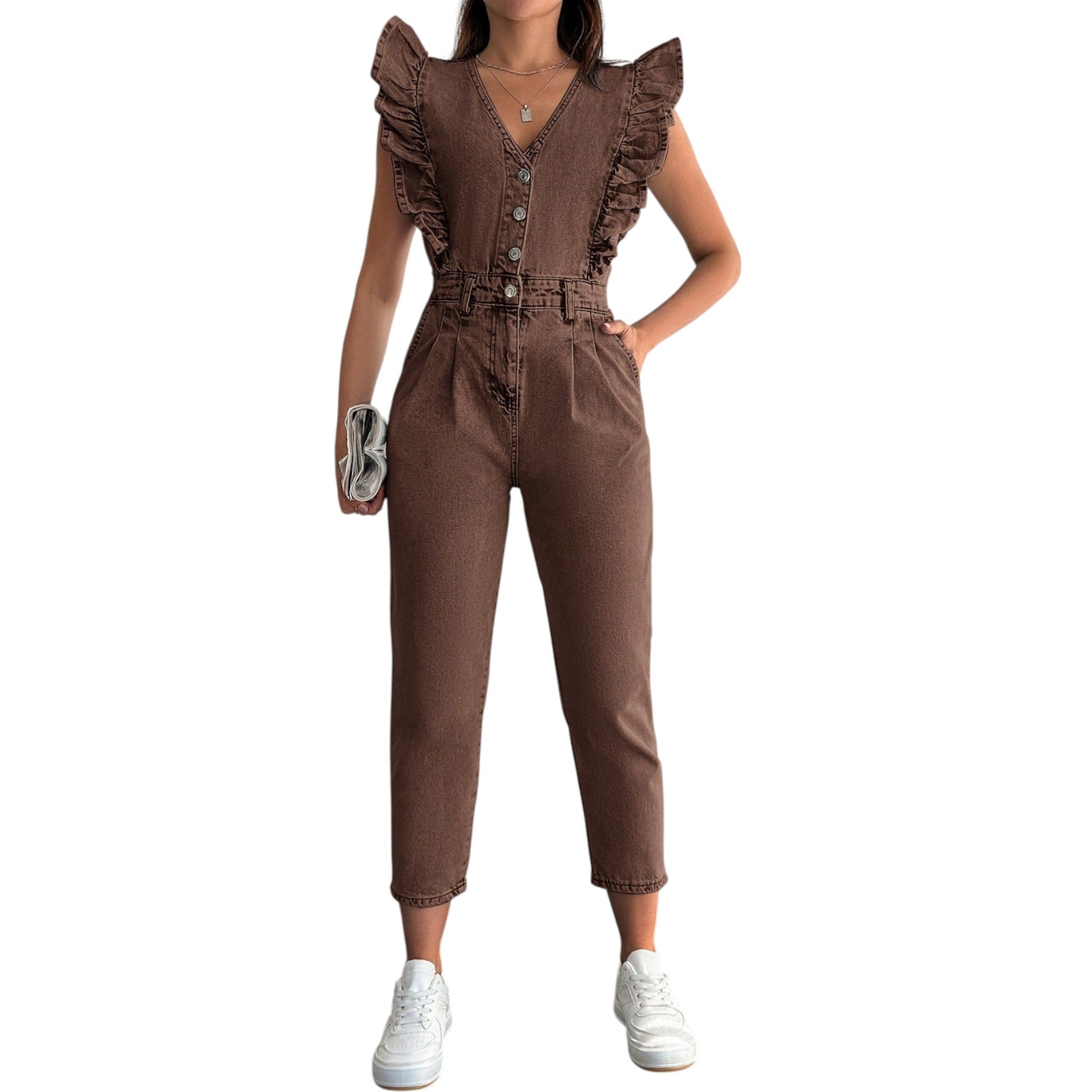 Címke nélküli, fekete, V-nyakú, fodros ujjú, gombos elöl, magas derekú, zsebes, tapered szárú.