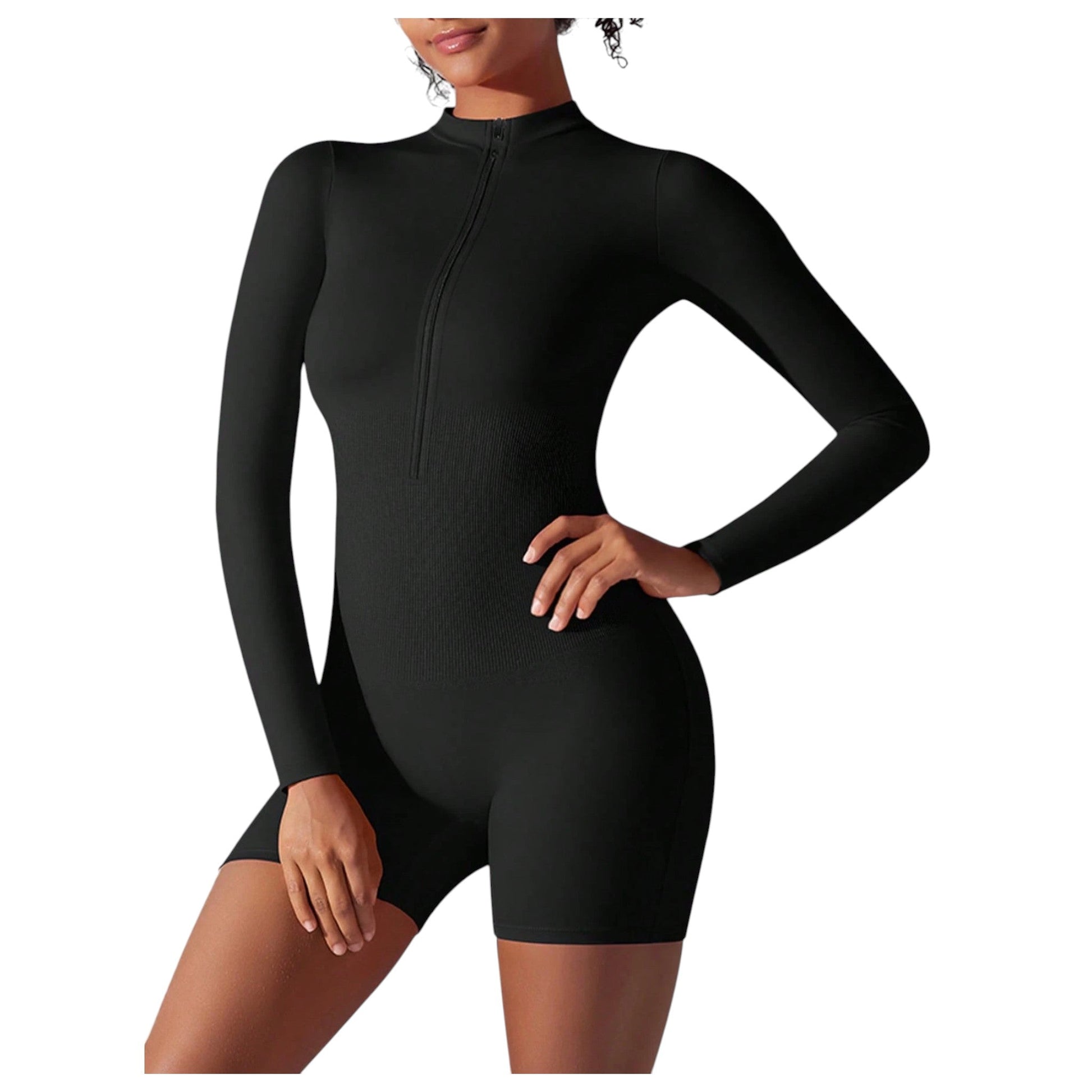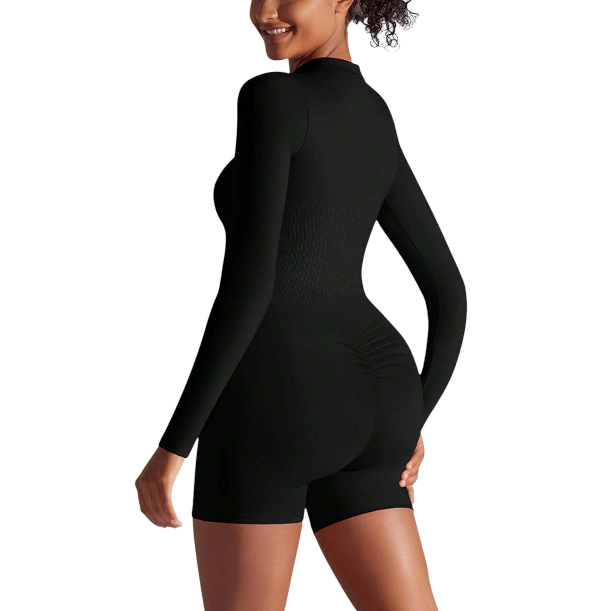 Címke nélküli, fekete, bordás anyagú, hosszú ujjú, magas nyakú, elöl cipzáros rövid kezeslábas.