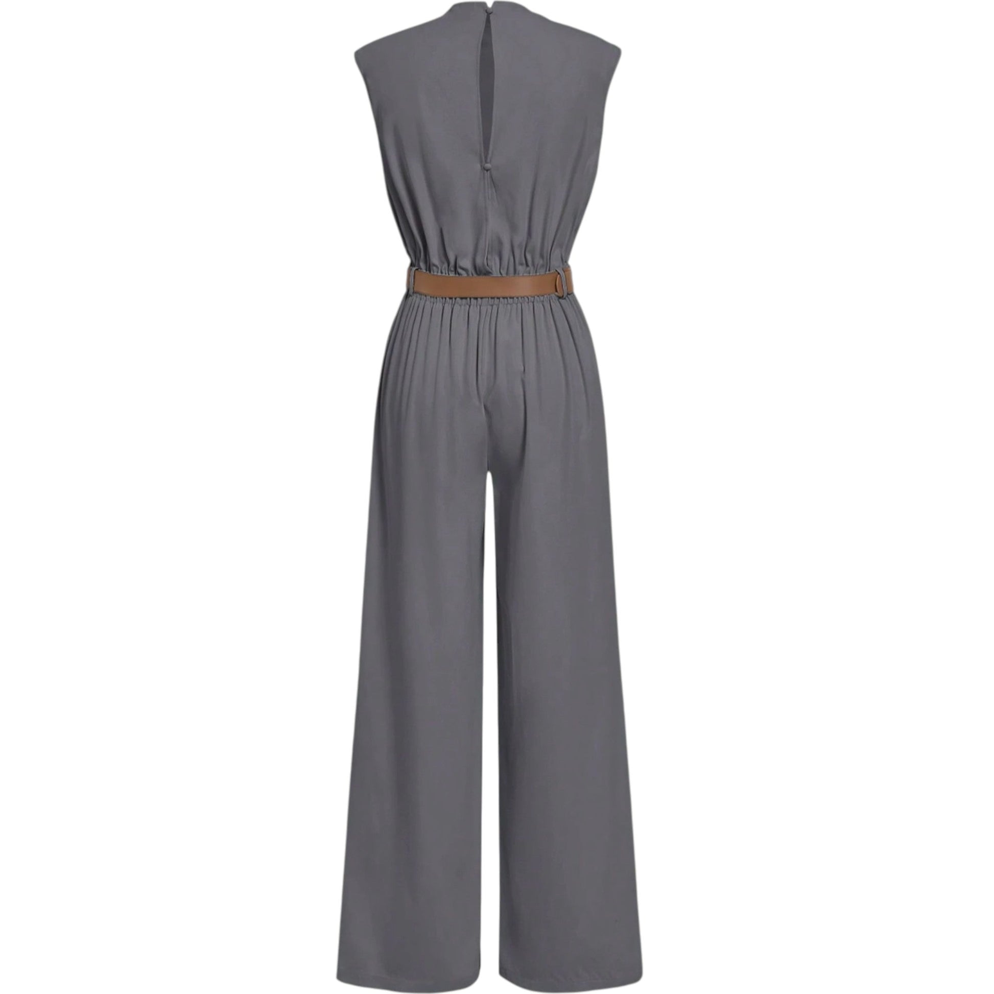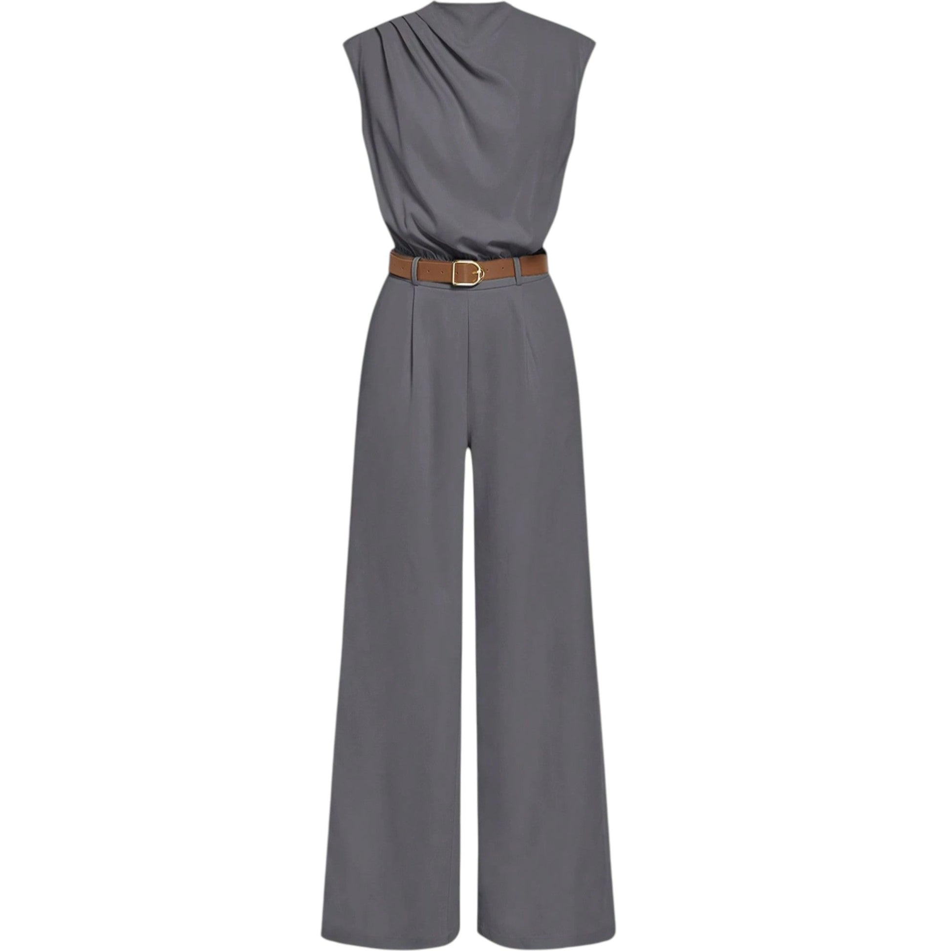 Címke nélküli, szürke, ráncolt, ujjatlan, bő szárú, hosszú nadrág.