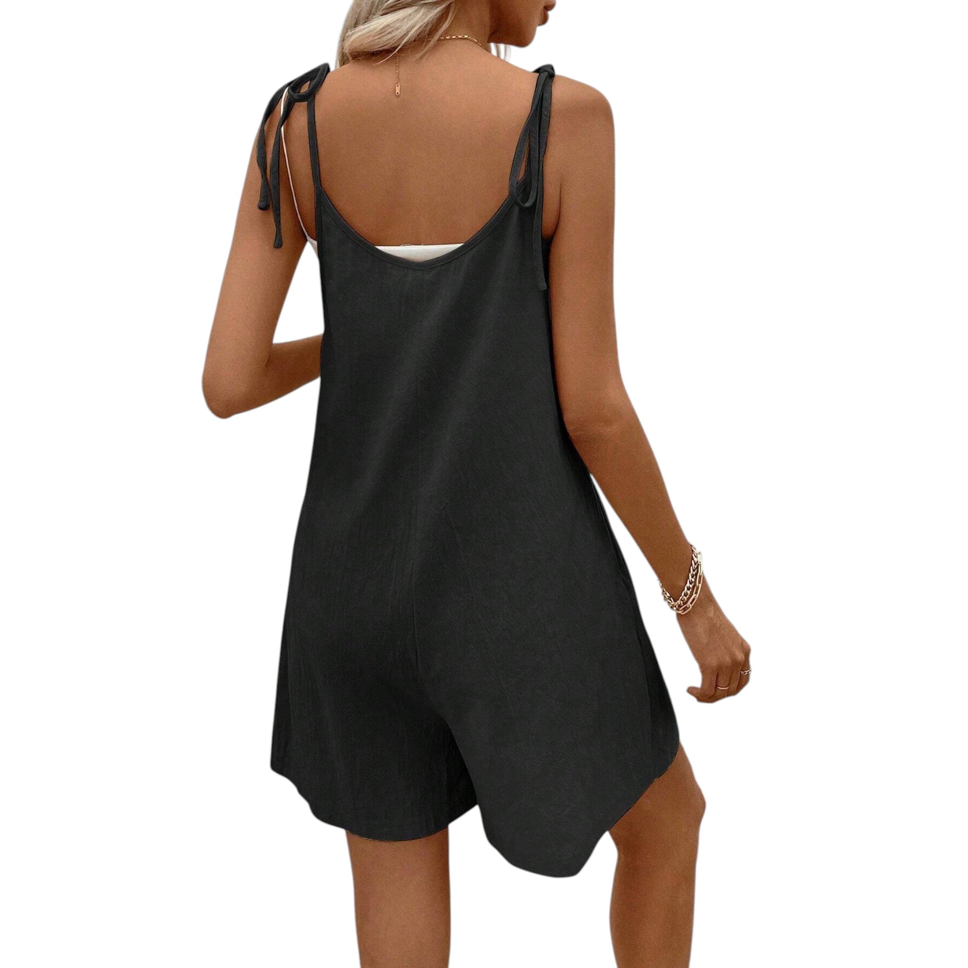 Címke nélküli, fekete, ujjatlan playsuit, megkötős vállpánttal, V-nyakkal.