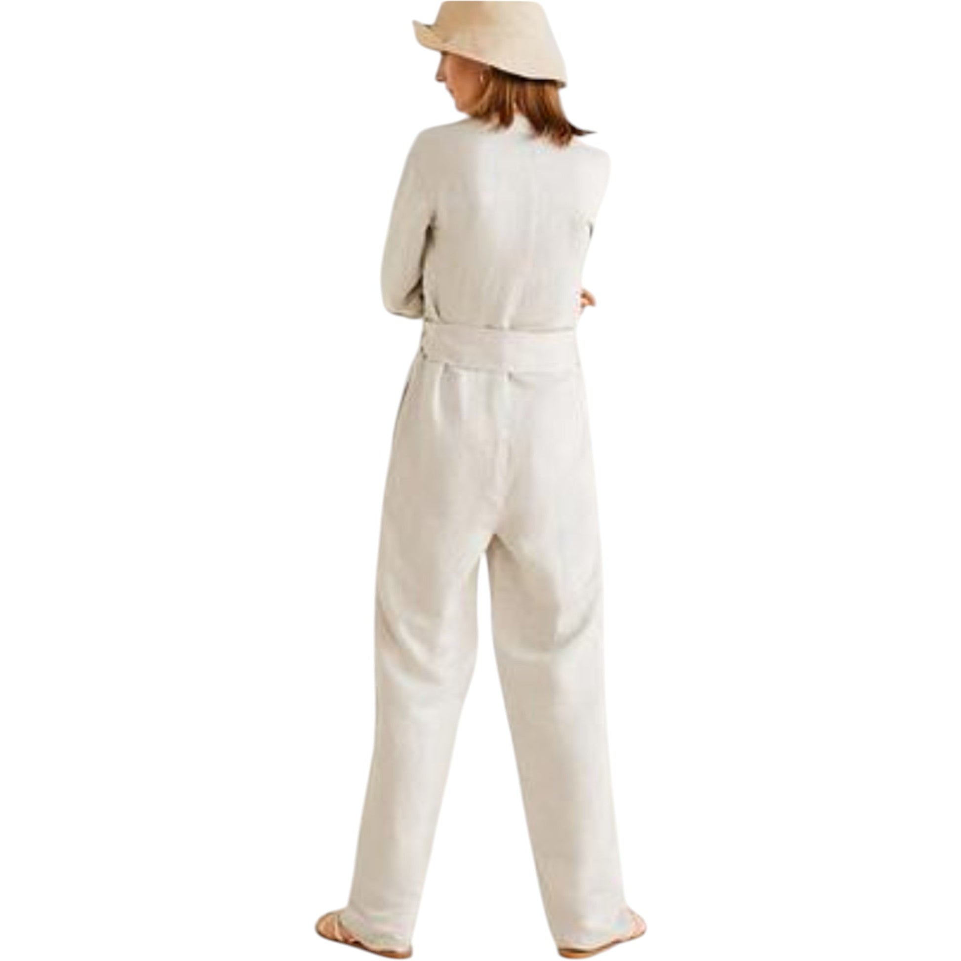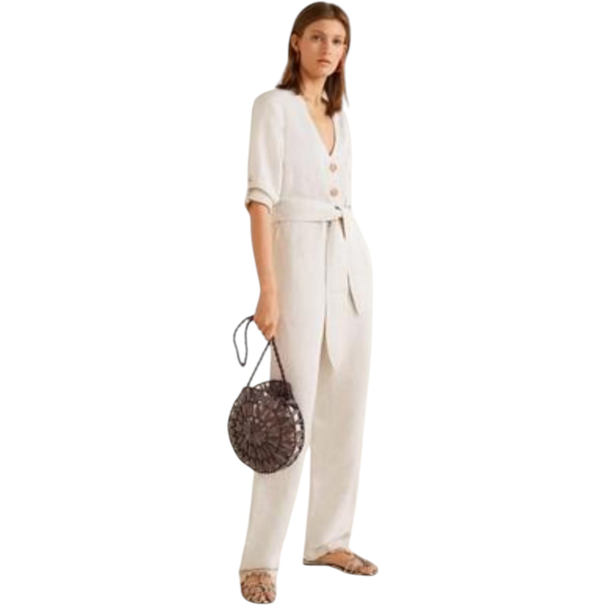 Címke nélküli, törtfehér, V-nyakú, rövid ujjú (felhajtott), hosszú szárú overall, elöl gombolásos, derékban ráncolt, egyenes, bő szárral.