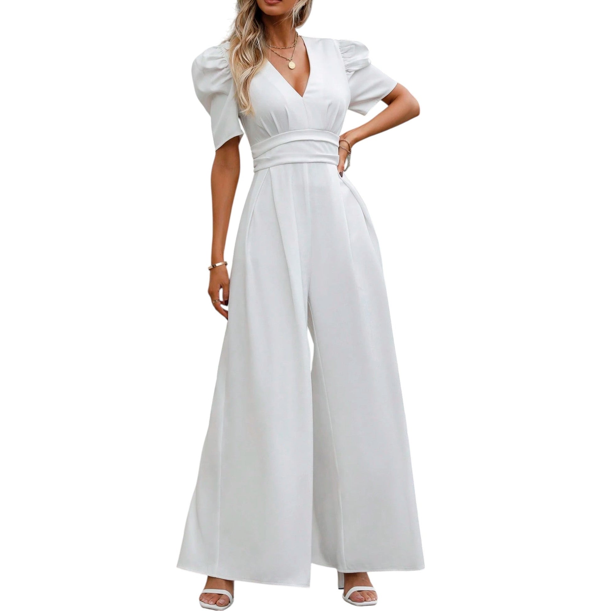 Címke nélküli, fehér, V-nyakú, széles szárú jumpsuit. Rövid, puffos ujjakkal. Mellrésznél behúzott, derékrésznél széles, övszerű pánttal díszített.