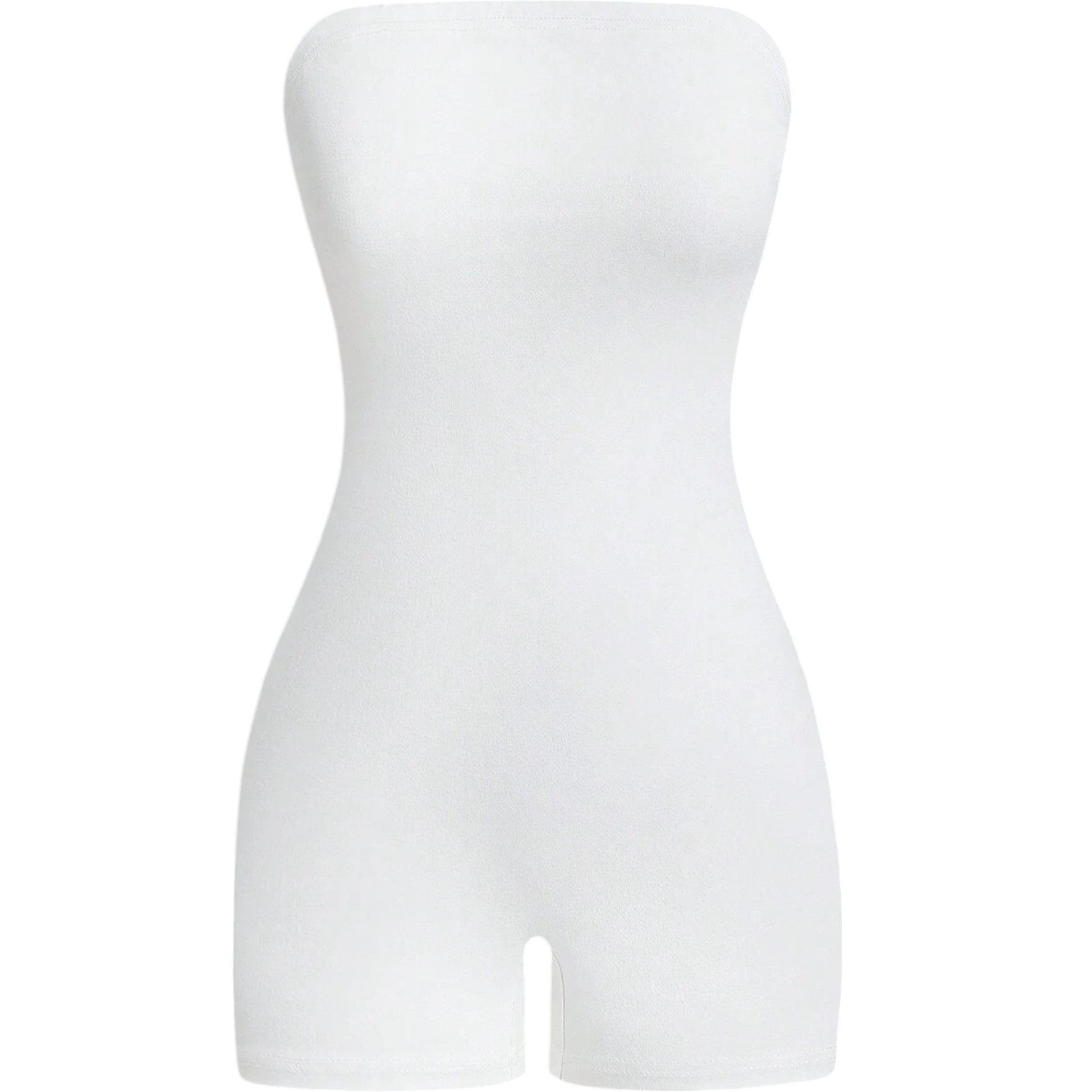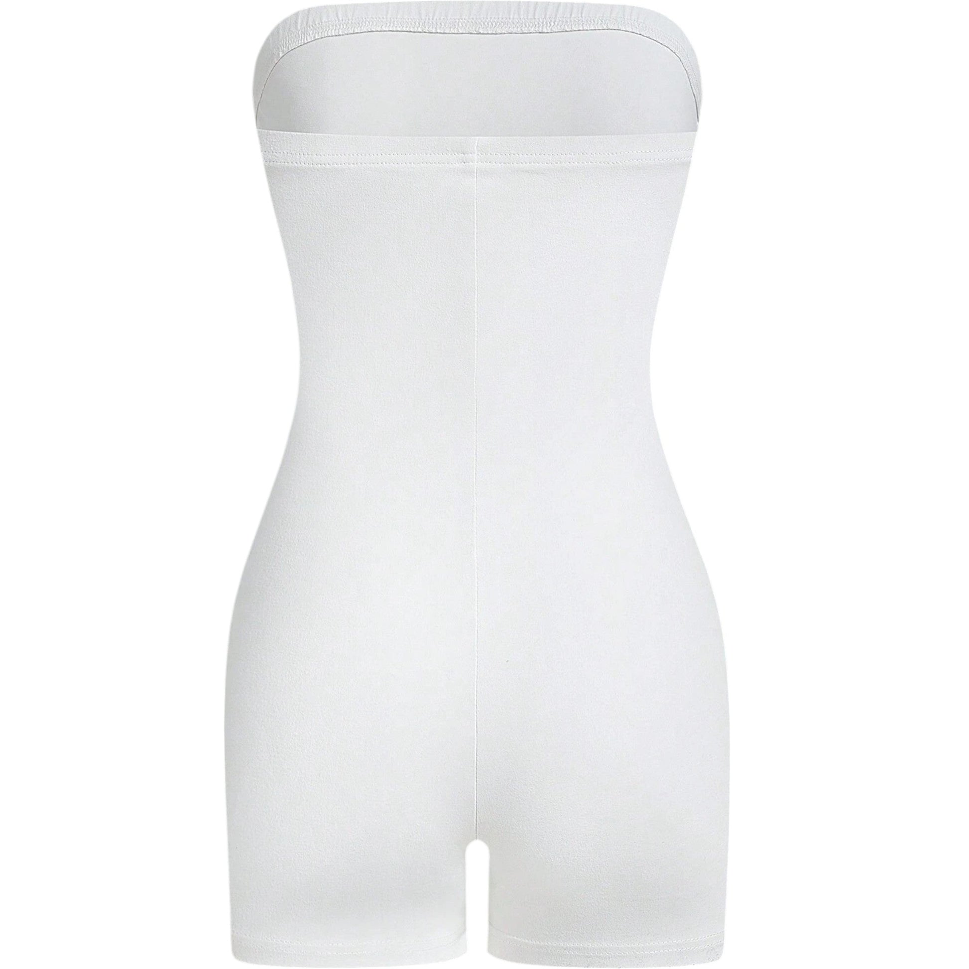 Címke nélküli, fehér, pánt nélküli, rövid szárú jumpsuit, testhezálló, egyszínű.