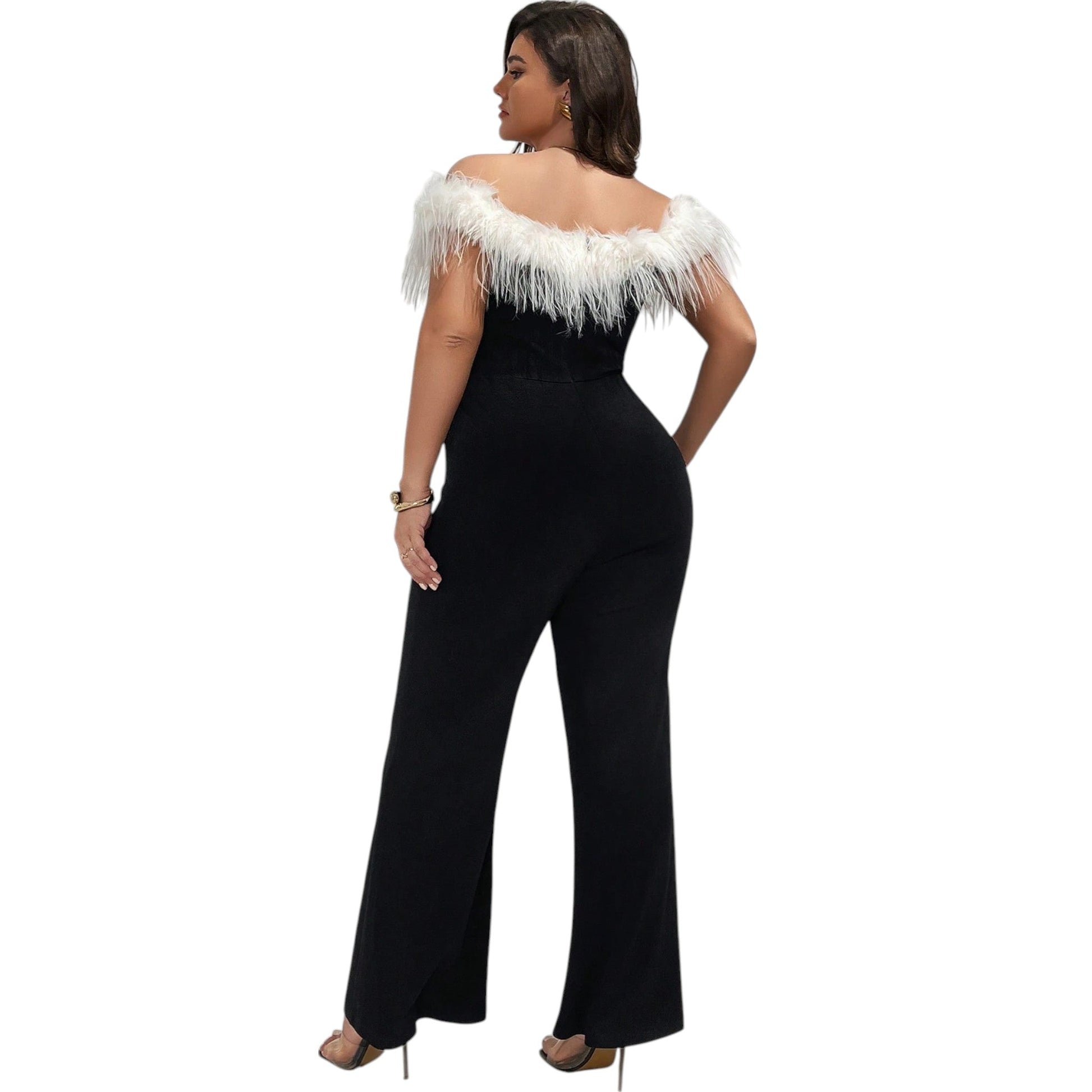 Címke nélküli, fekete, pánt nélküli, mellrészen toll díszítésű, széles szárú jumpsuit.