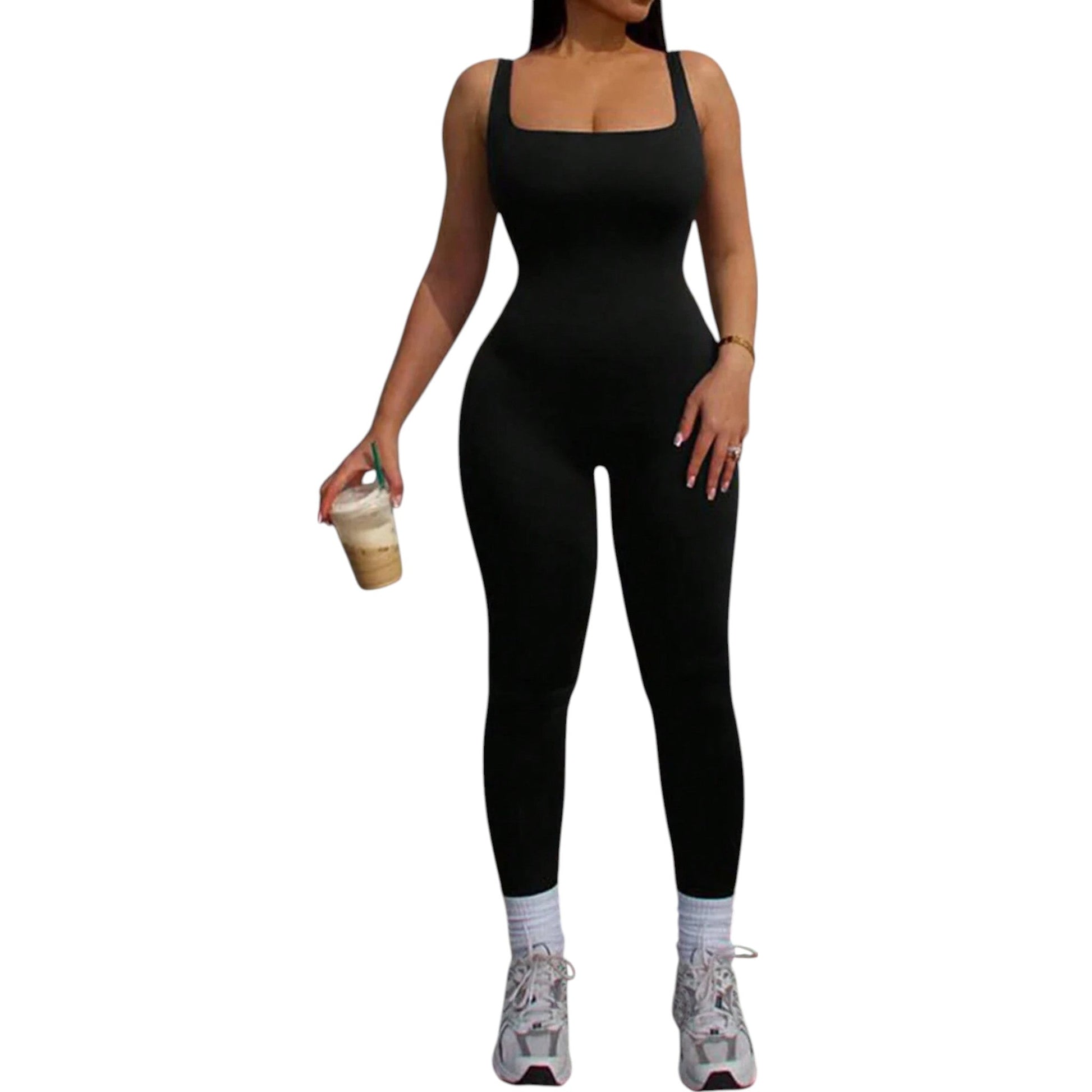 Címke nélküli, fekete, ujjatlan, négyzet alakú nyakkivágású, testhezálló jumpsuit, hosszú szárral.