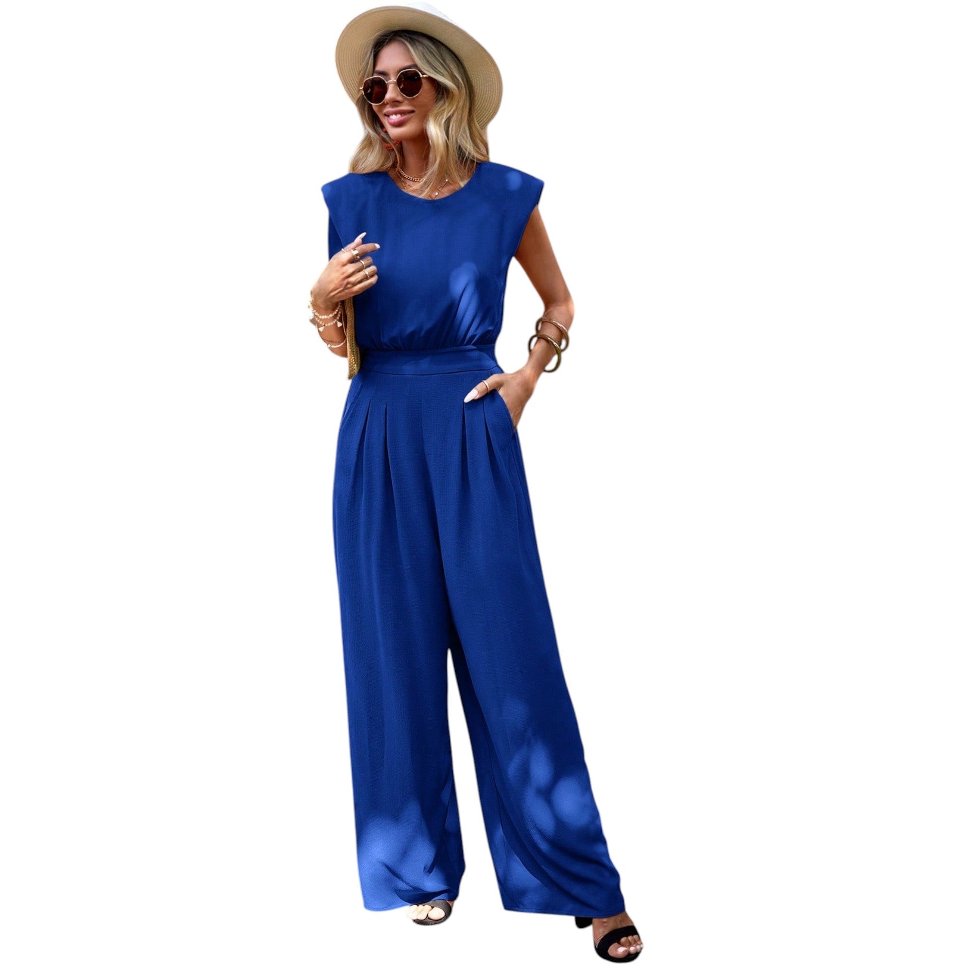 Címke nélküli, kék, ujjatlan, kerek nyakú, redőzött, bő szárú kezeslábas, rugalmas derékkal és oldalsó zsebekkel.