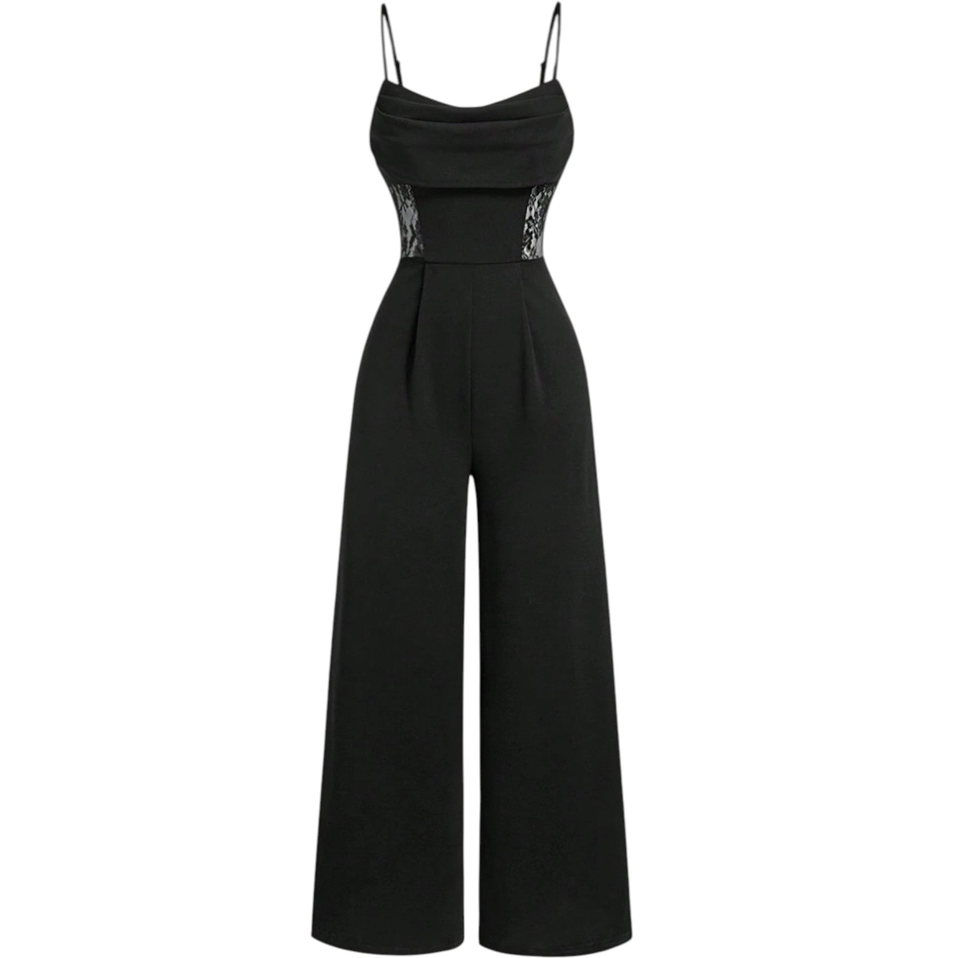 Címke nélküli, fekete, széles szárú, spagetti pántos, csónaknyakú, csipke betéttel a deréknál, hosszú jumpsuit.