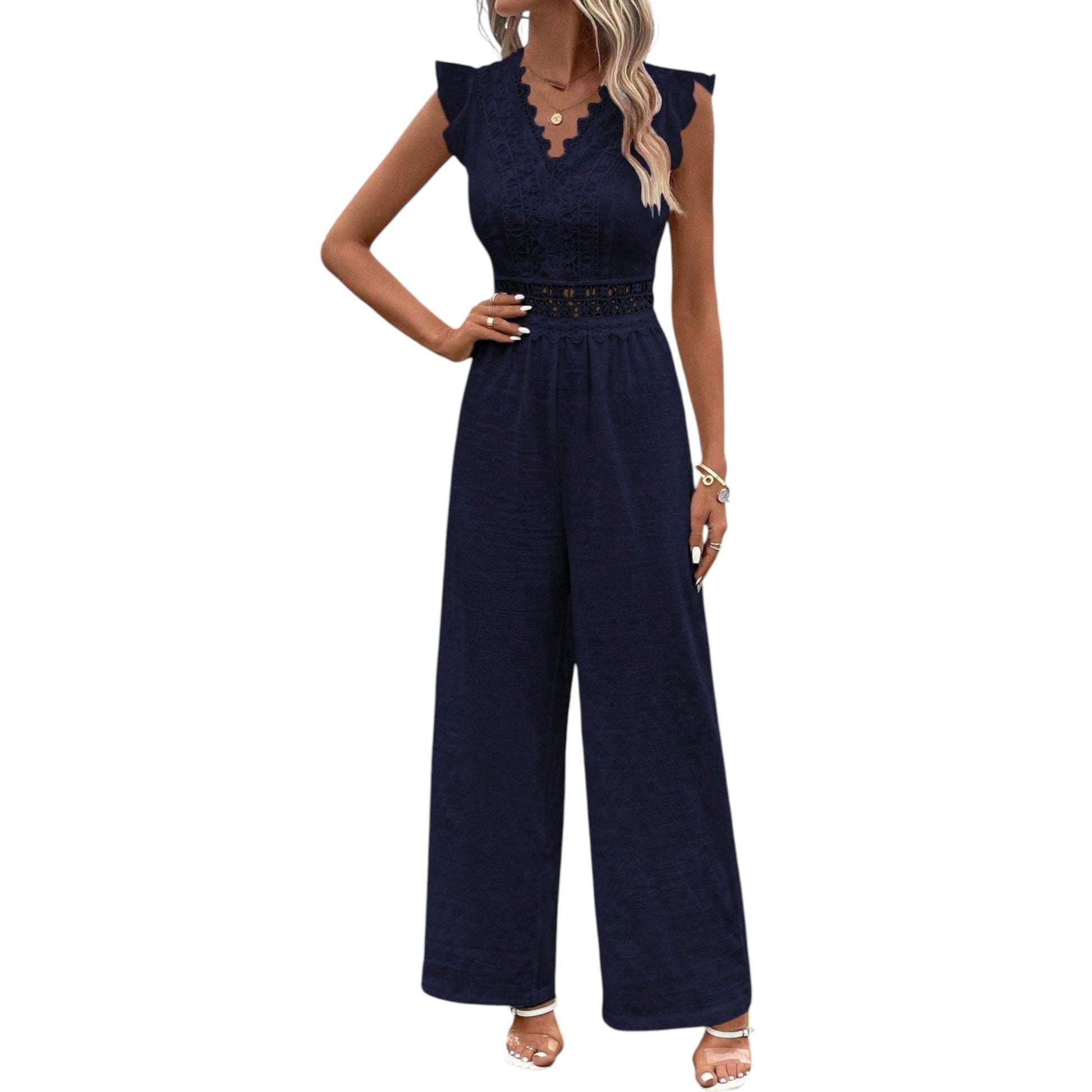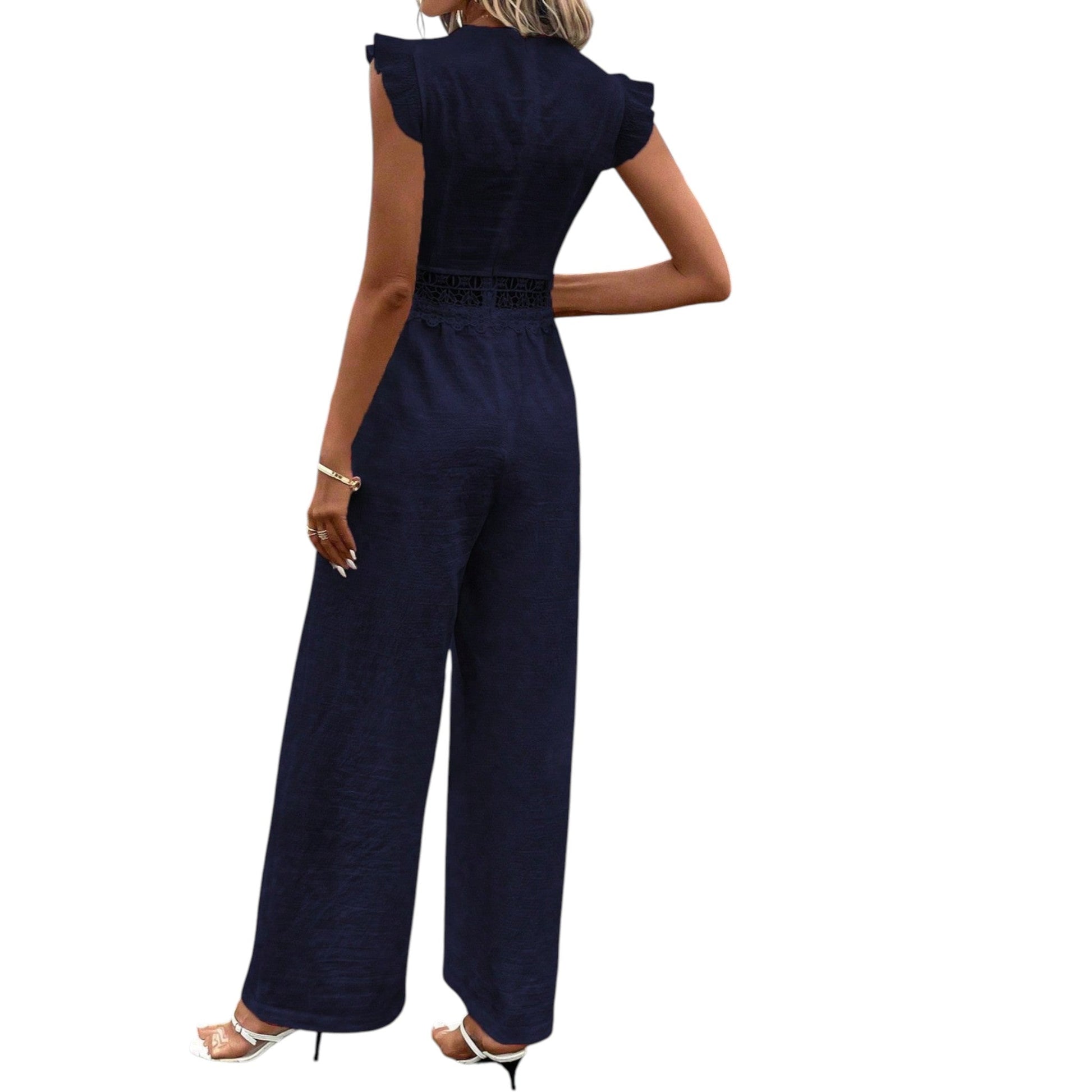 Címke nélküli, sötétkék, V-nyakú, ujjatlan, fodros vállú, csipkebetétes mellrész és derék, hosszú, széles szárú nadrág.