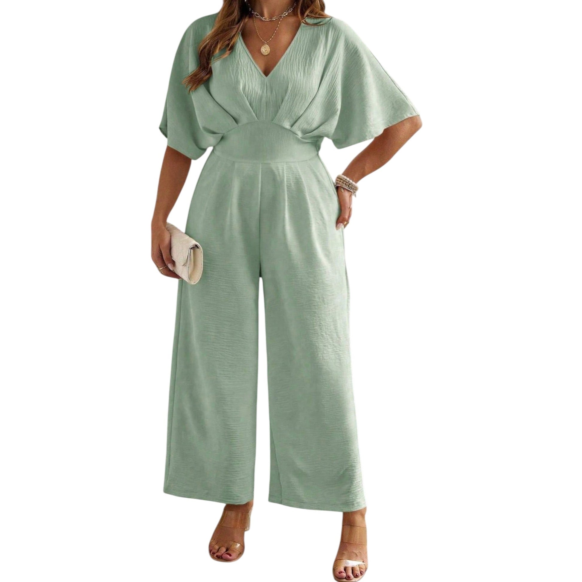 Címke nélküli, mentazöld, V-nyakú, rövid, denevérujjú, ráncolt mellrész és derék, hosszú, széles szárú nadrág.
