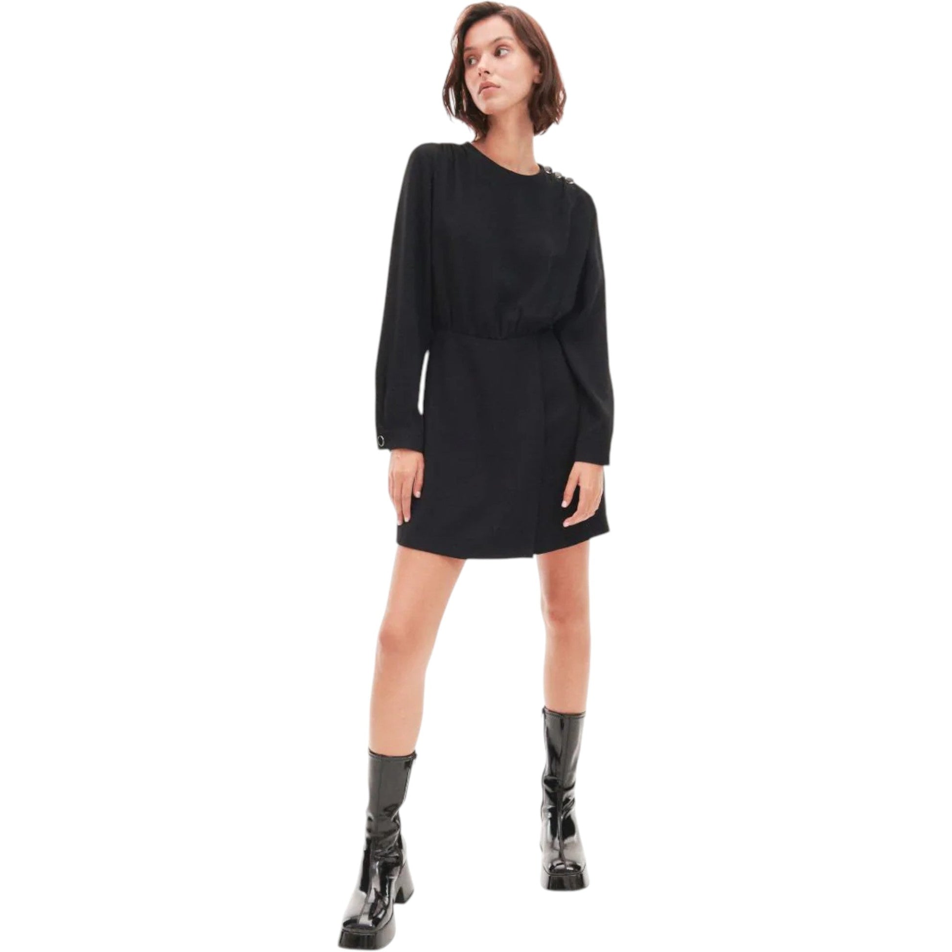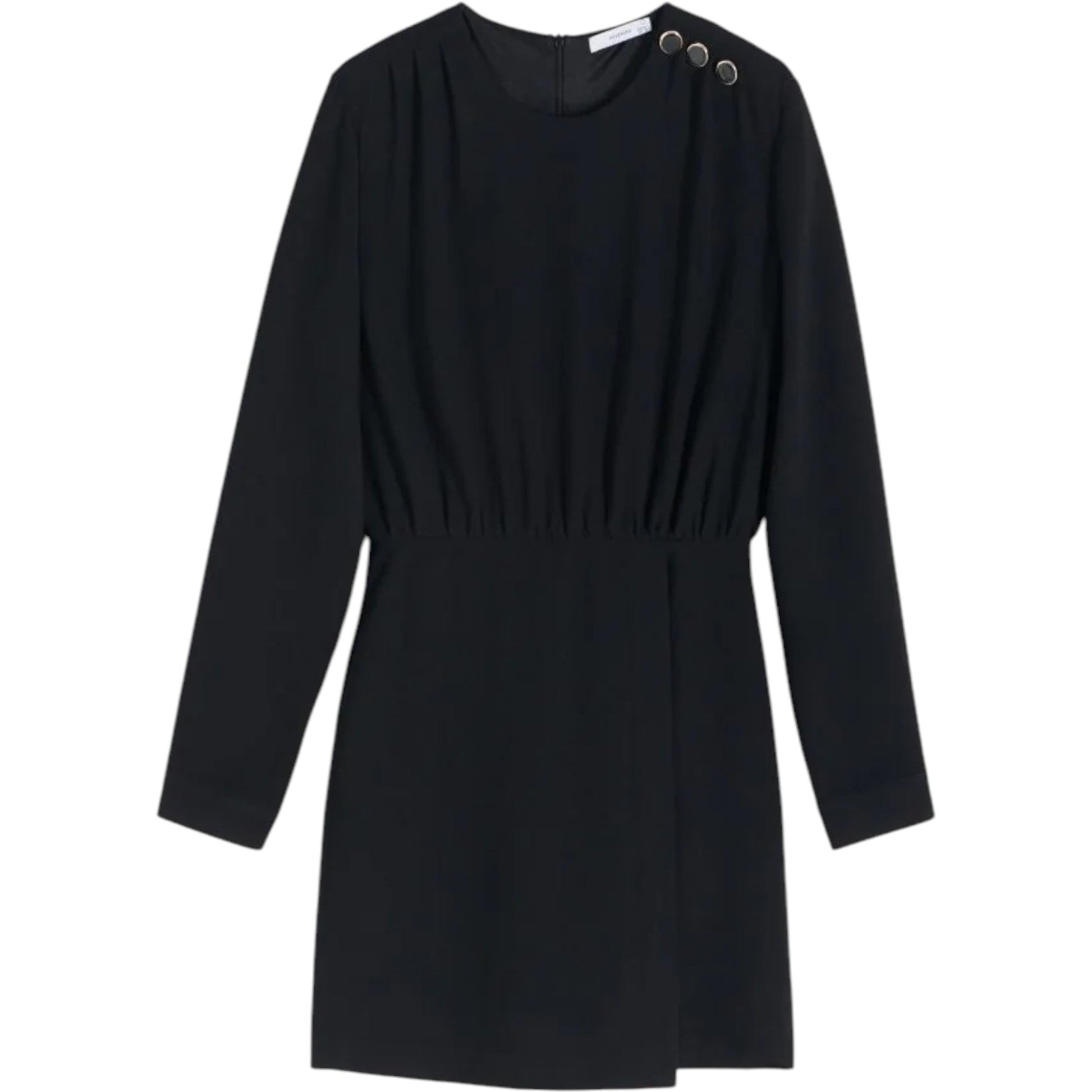 Címke nélküli, fekete, hosszú ujjú, mini ruha, kerek nyakkivágással, a vállon fém díszgombokkal, elöl átlapolt hatású alsó résszel, gumírozott, ráncolt derékkal.