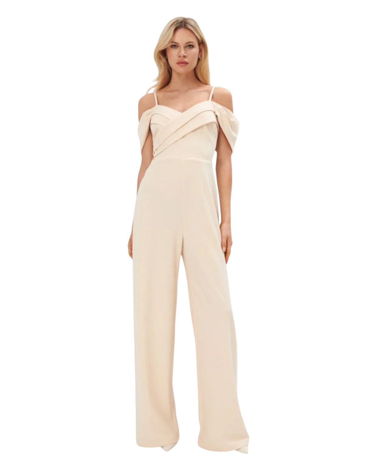 Címke nélküli, törtfehér, spagettipántos, vállat szabadon hagyó, ráncolt mellrész, bő szárú, elegáns overall