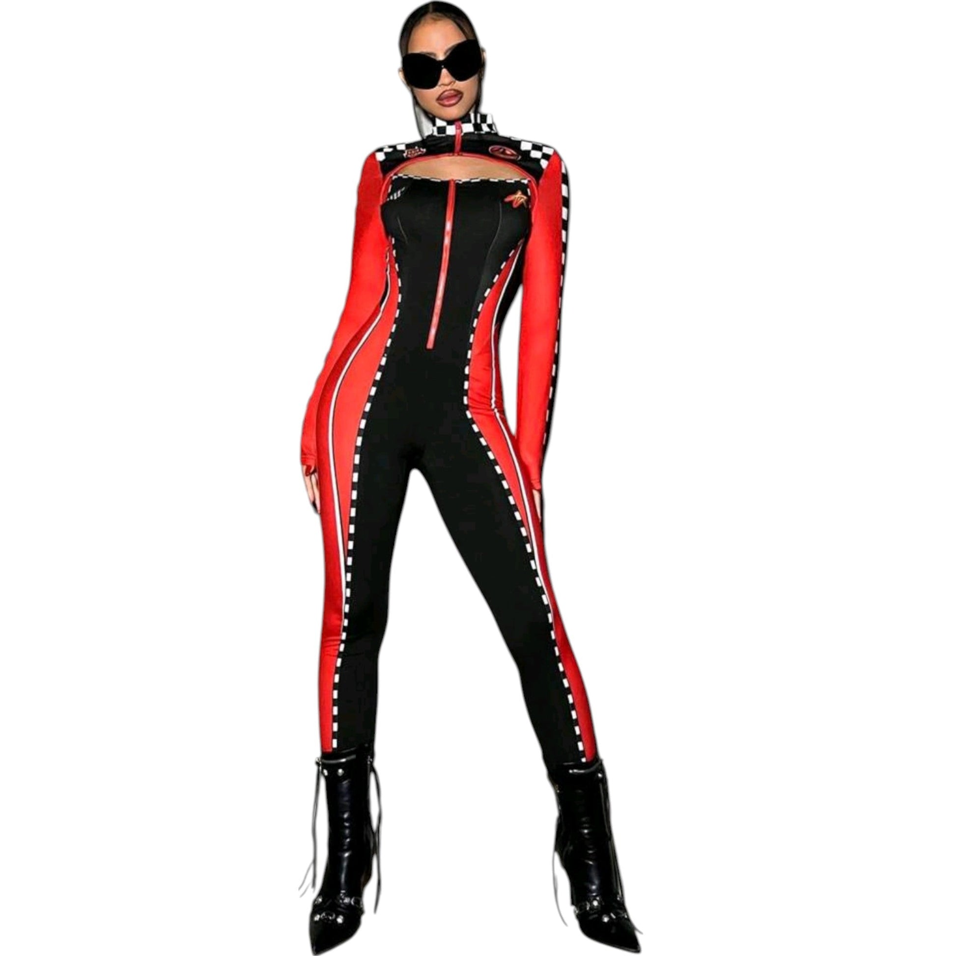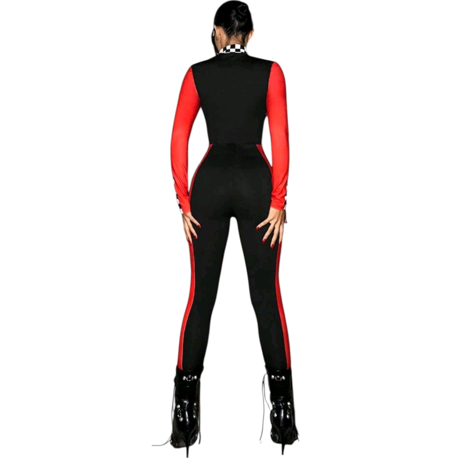 Címke nélküli, fekete és piros, hosszú ujjú, magas nyakú, cipzáras overall, fehér csíkokkal és kockás gallérral.