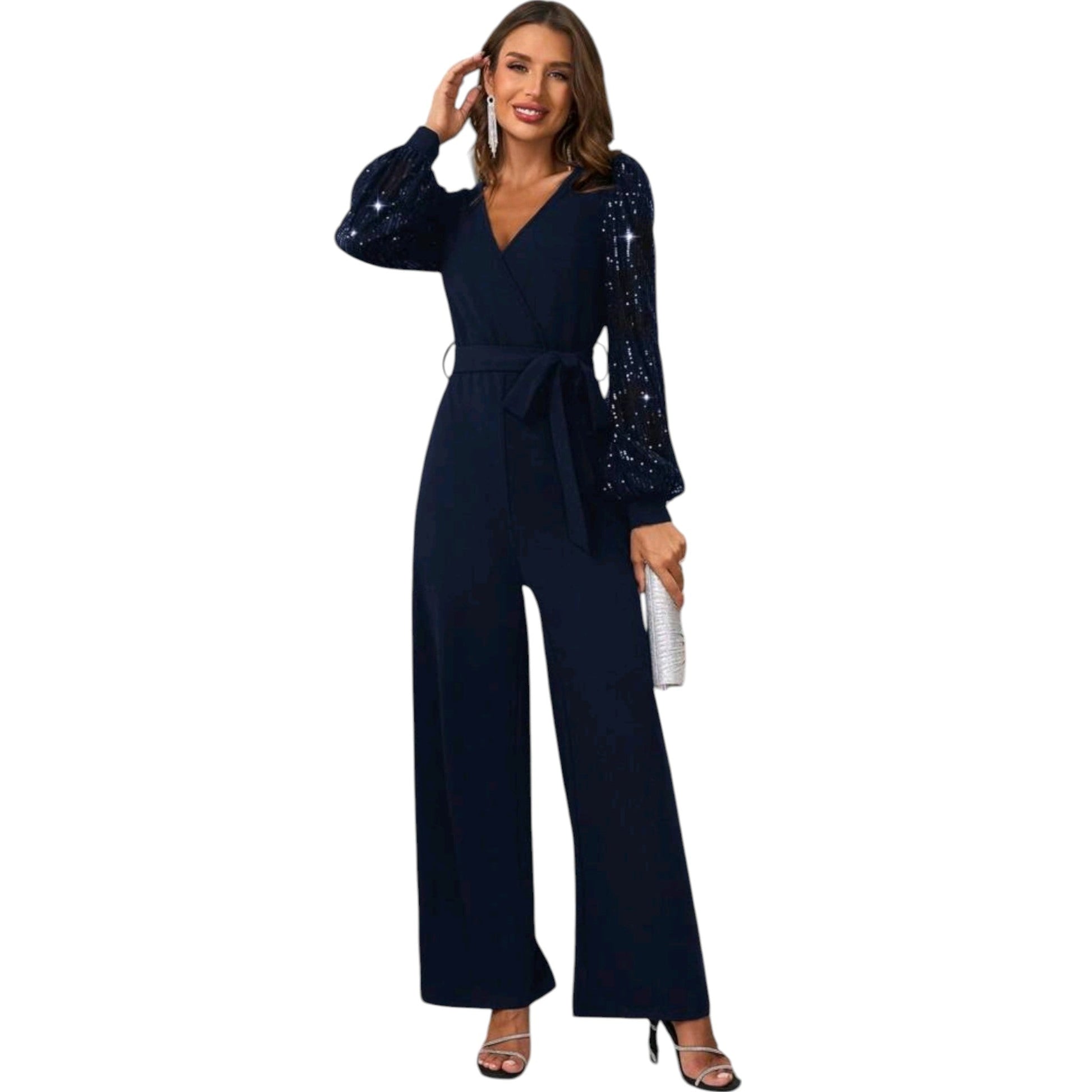 Címke nélküli, sötétkék, elegáns overall, V-nyakkal, csillogó, puffos hosszú ujjakkal és megkötős derékkal.