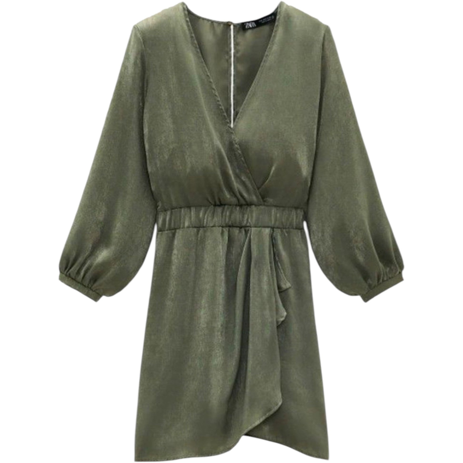 Címke nélküli, khaki zöld, selyemhatású/fényes anyagú, hosszú ujjú (enyhén puffos), V-nyakú átlapolós (wrap) mini ruha, gumírozott derékkal, enyhén aszimmetrikus alsó szegéllyel, hátulról fotózva.