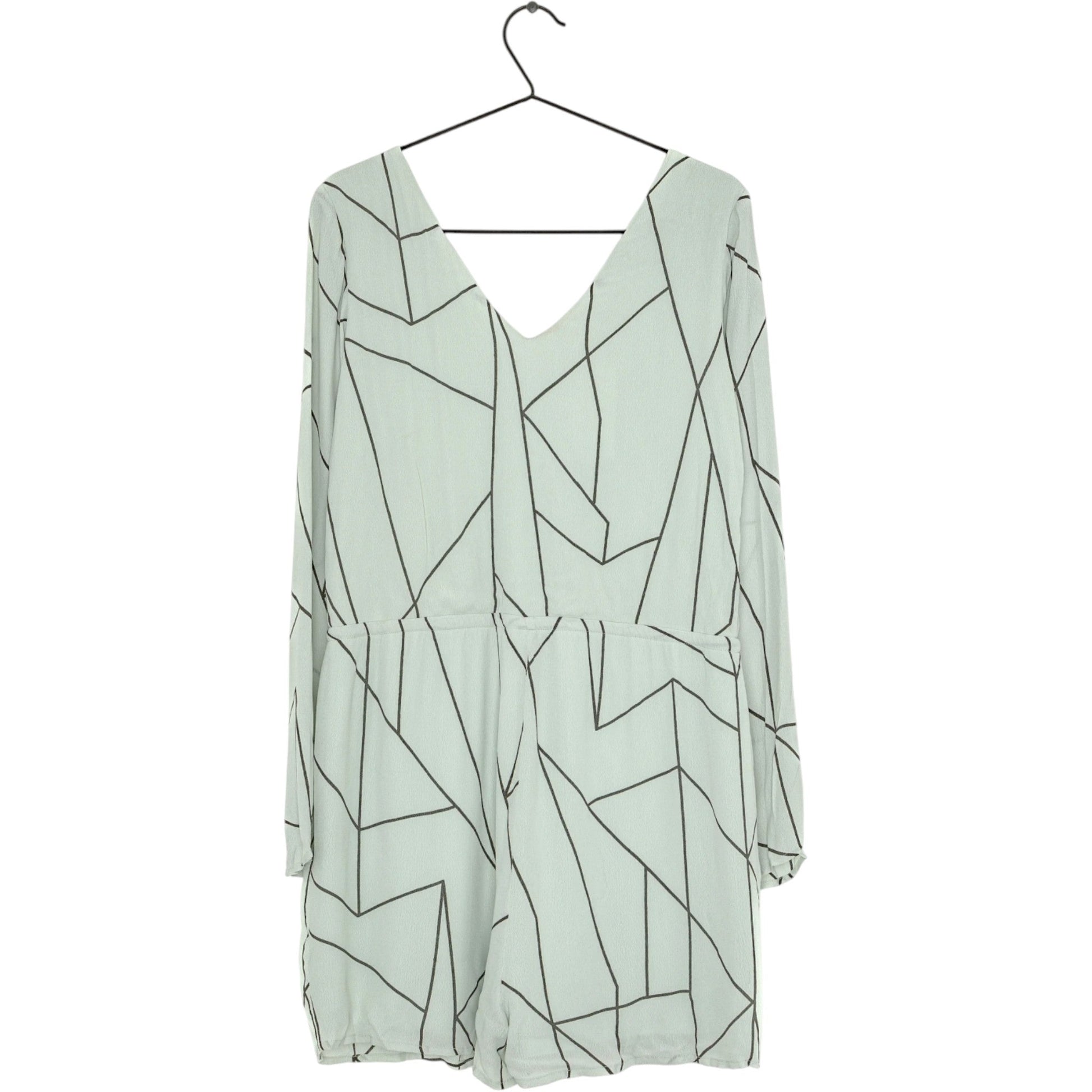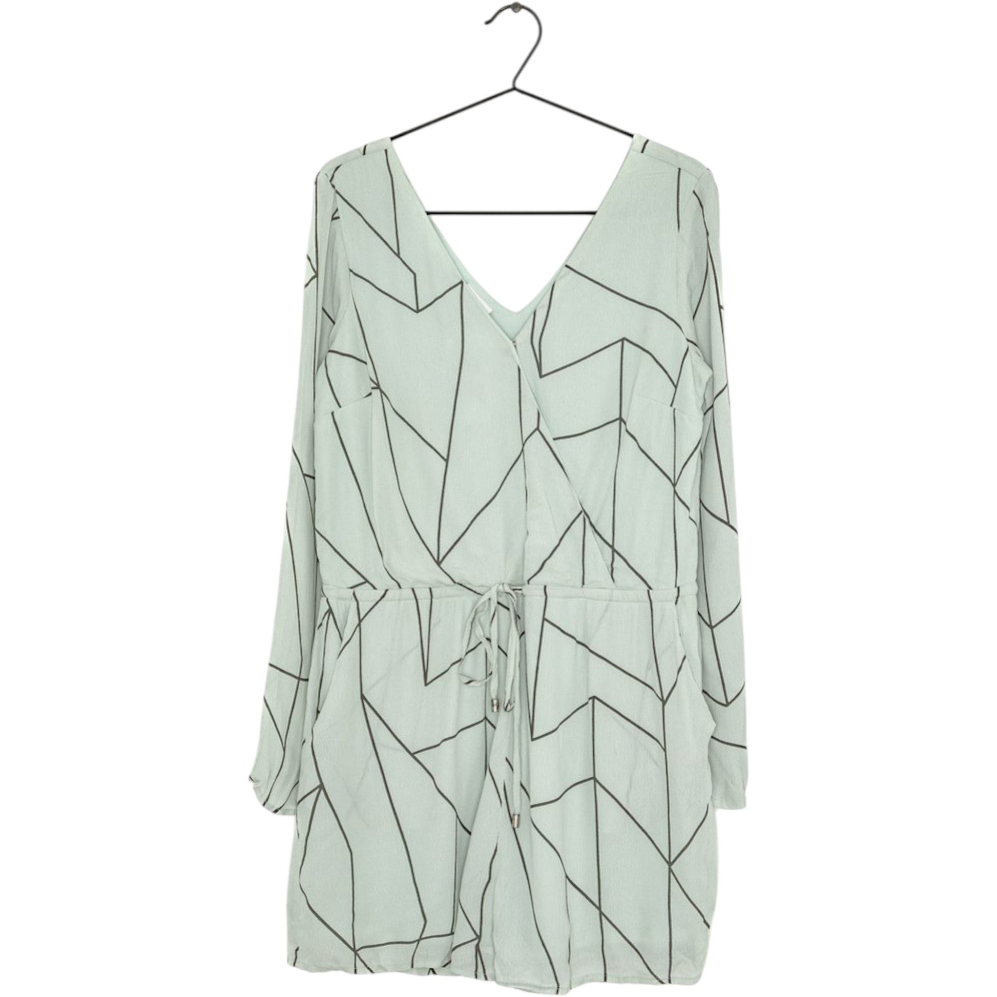 Címke nélküli, mentazöld alapon fekete geometrikus mintás, hosszú ujjú, V-nyakú átlapolós (wrap) rövid overál (playsuit), megkötős derékkal, akasztón lógva.