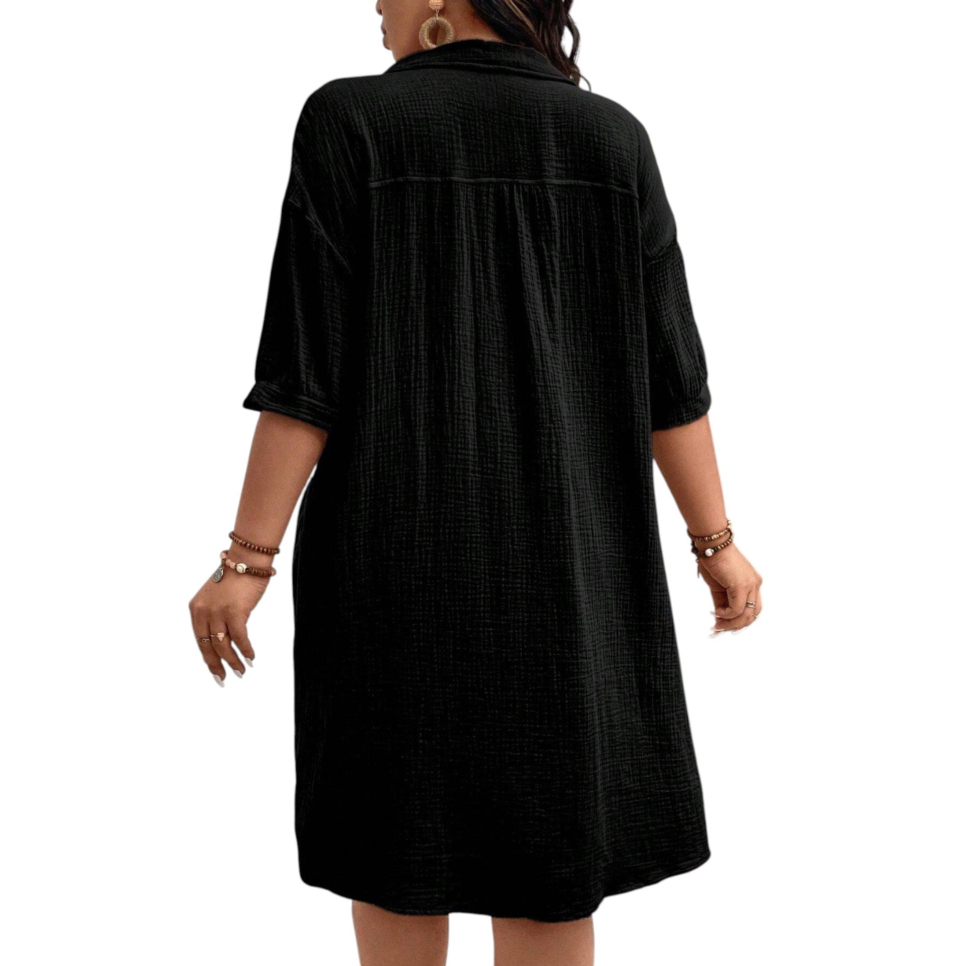 Címke nélküli, fekete, inggalléros, rövid ujjú, gombos, zsebes, mini ingruha.