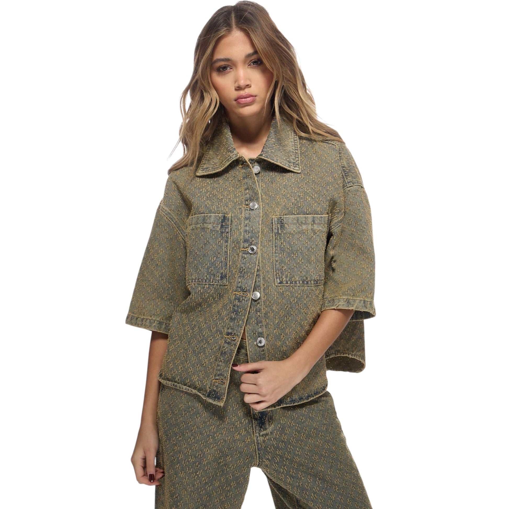 Címke nélküli, zöldesbarna, mintás, galléros, gombos, rövid ujjú, zsebes farmer ing.