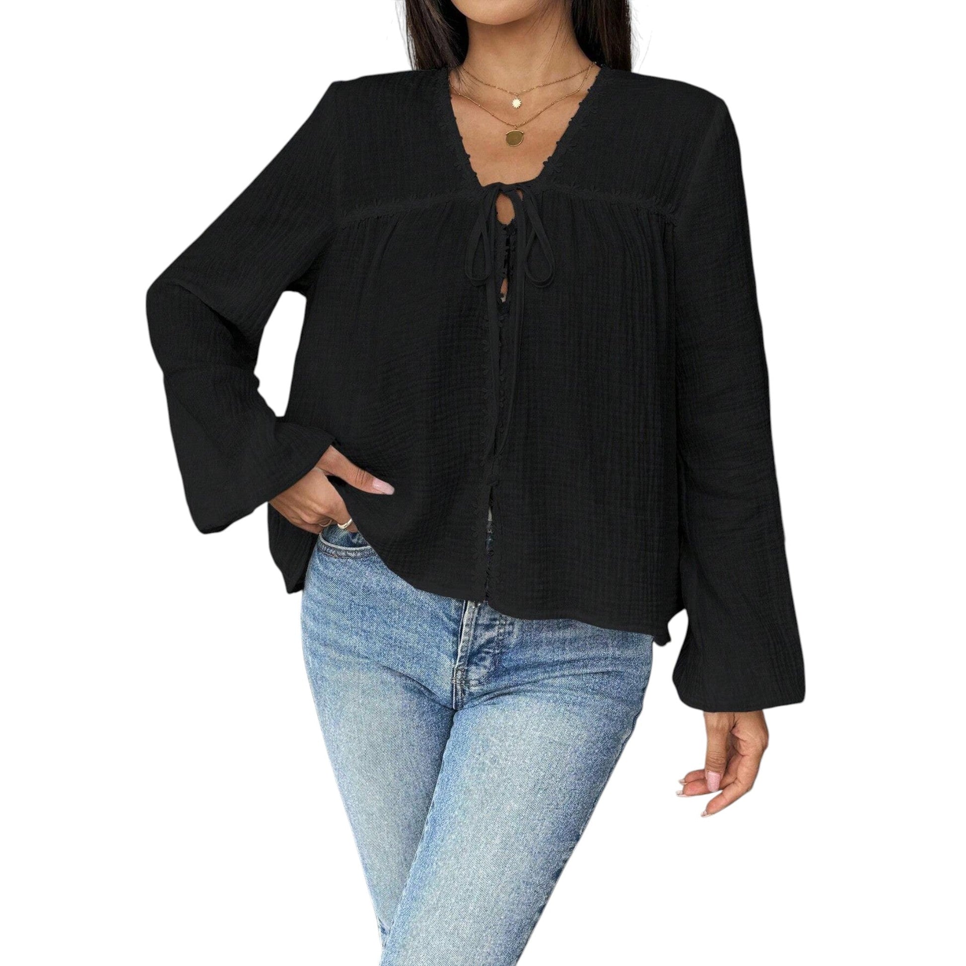 Címke nélküli, fekete, V-nyakú, elöl megkötős, hosszú, bő ujjú, ráncolt textúrájú.