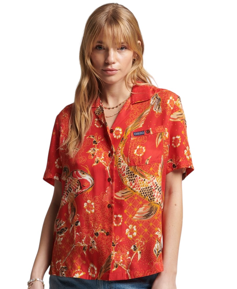 Címke nélküli, piros (narancs/sárga/fekete mintával), szövet, laza fazon, kubai gallér, rövid ujj, koi ponty minta, mellzseb.