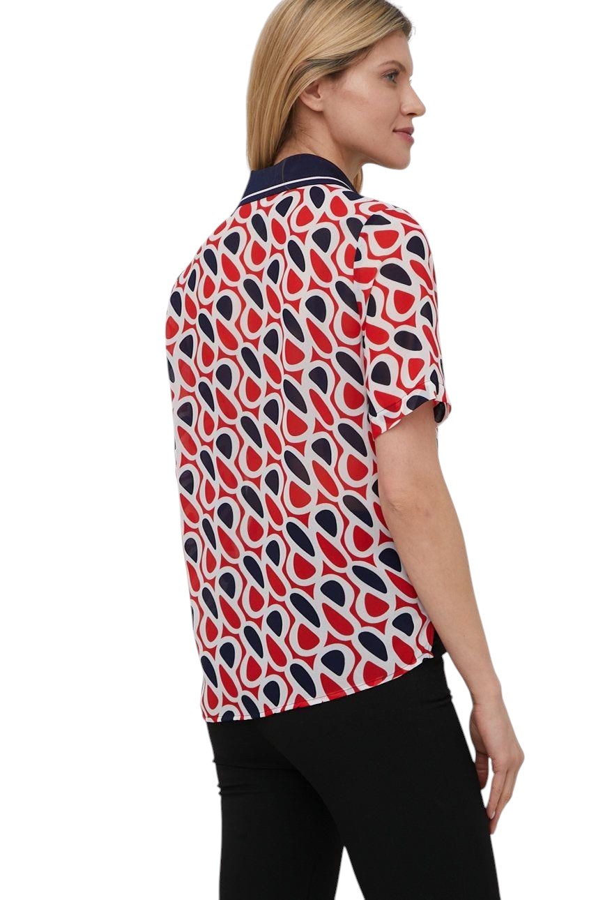 Címke nélküli, piros, fekete, fehér, szövet, normál fazon, inggallér V-nyakkivágással, rövid ujj, geometrikus minta.