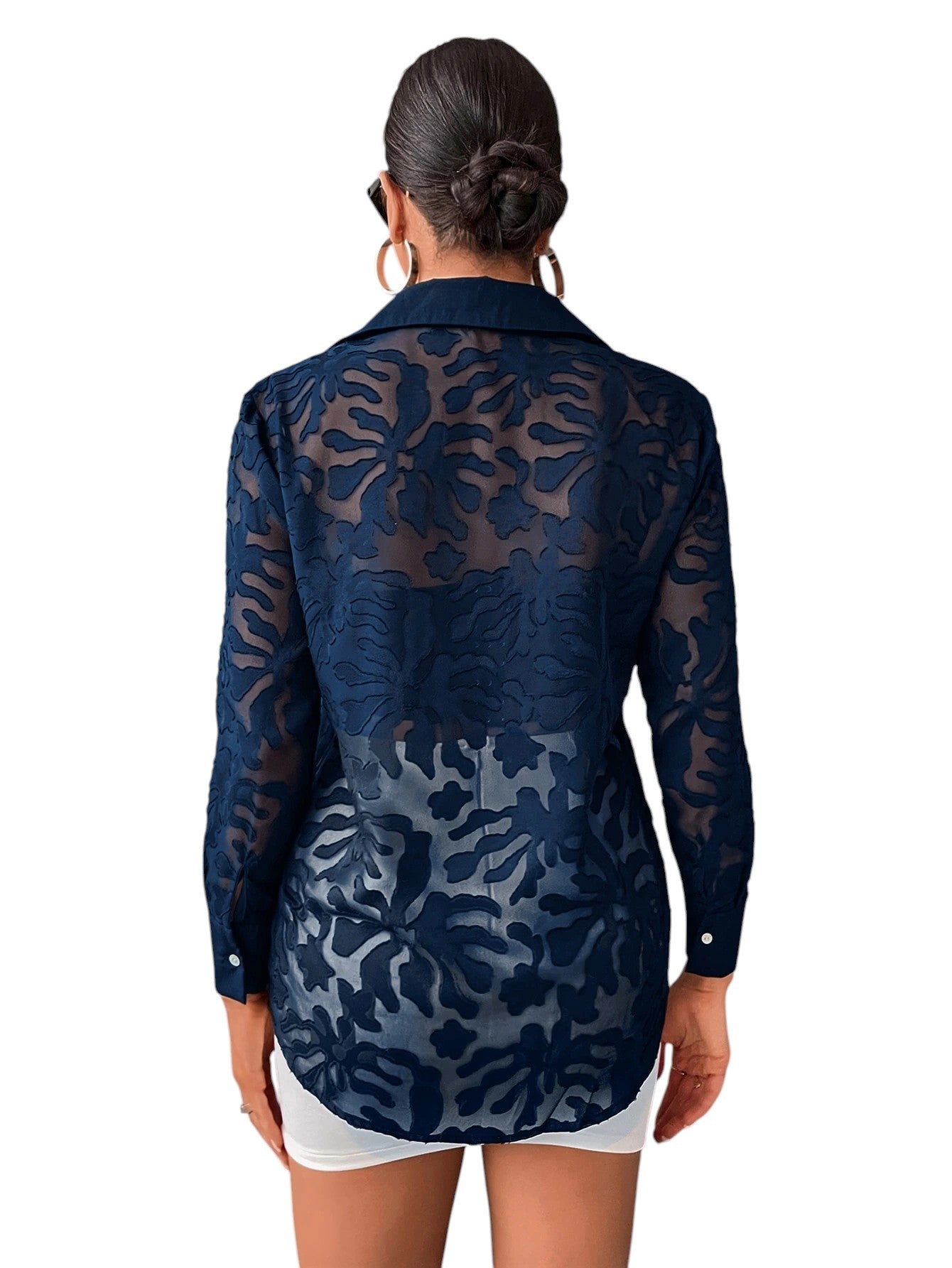 Címke nélküli, sötétkék alapon sötétebb virágmintás, galléros, hosszú áttetsző ujjú, gombos blúz