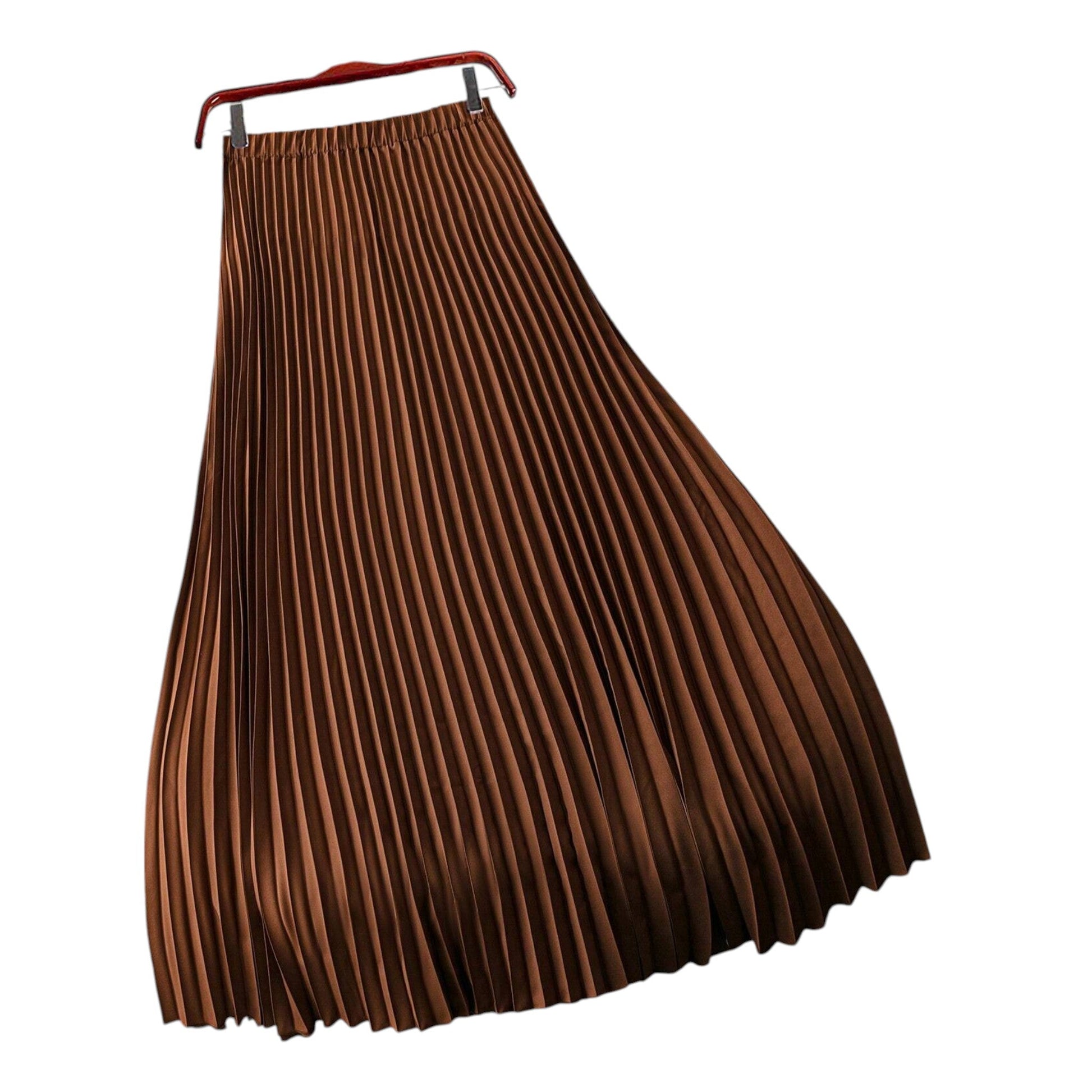 Címke nélküli, barna, gumis derekú, pliszírozott, A-vonalú maxi szoknya.