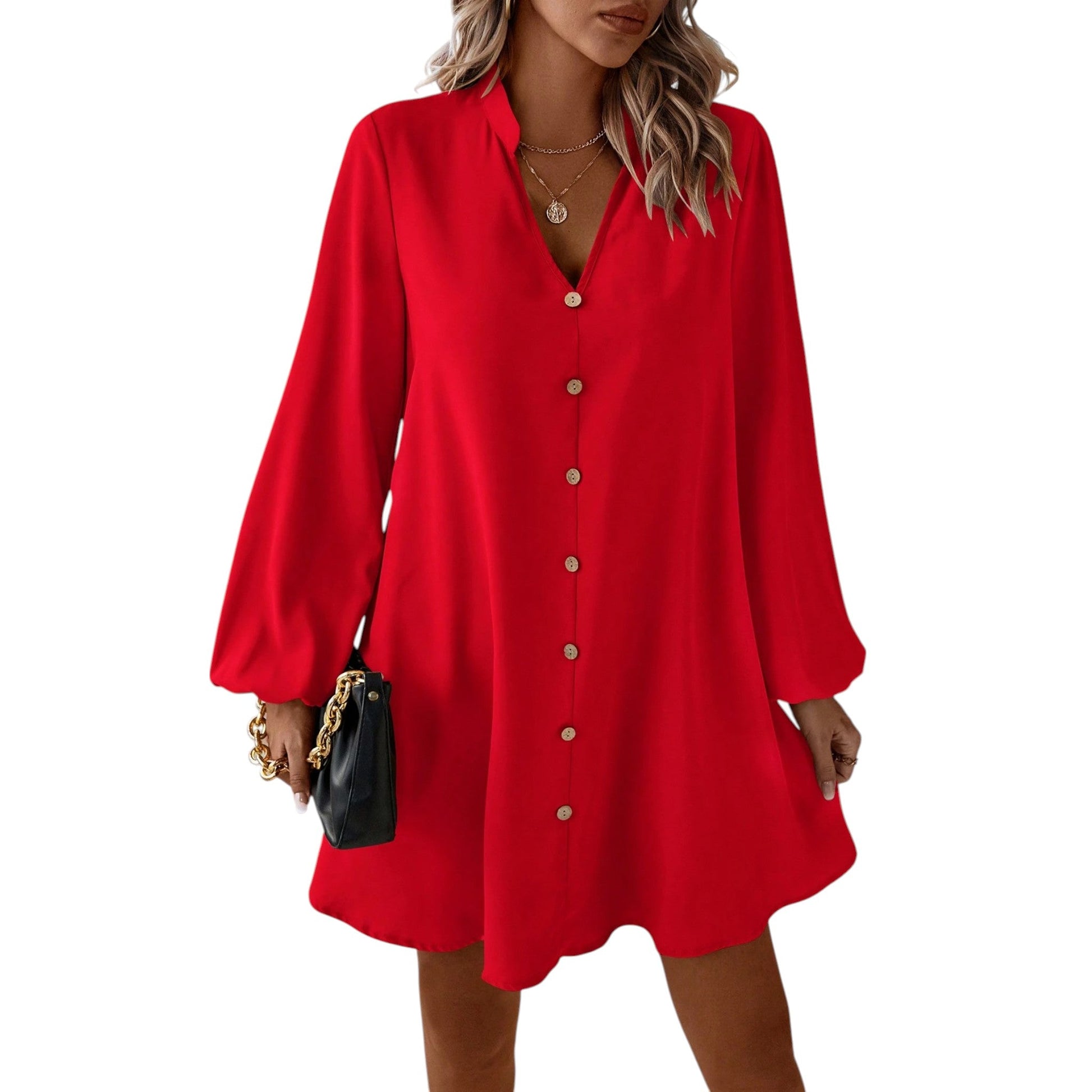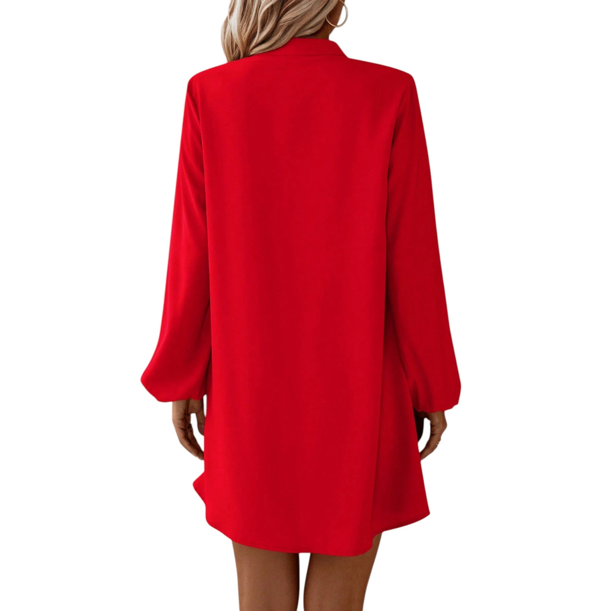 Címke nélküli, piros ingruha. Hosszú ujjú, galléros, elöl gombos záródású, V-nyakú. Rövid, bő fazonú.