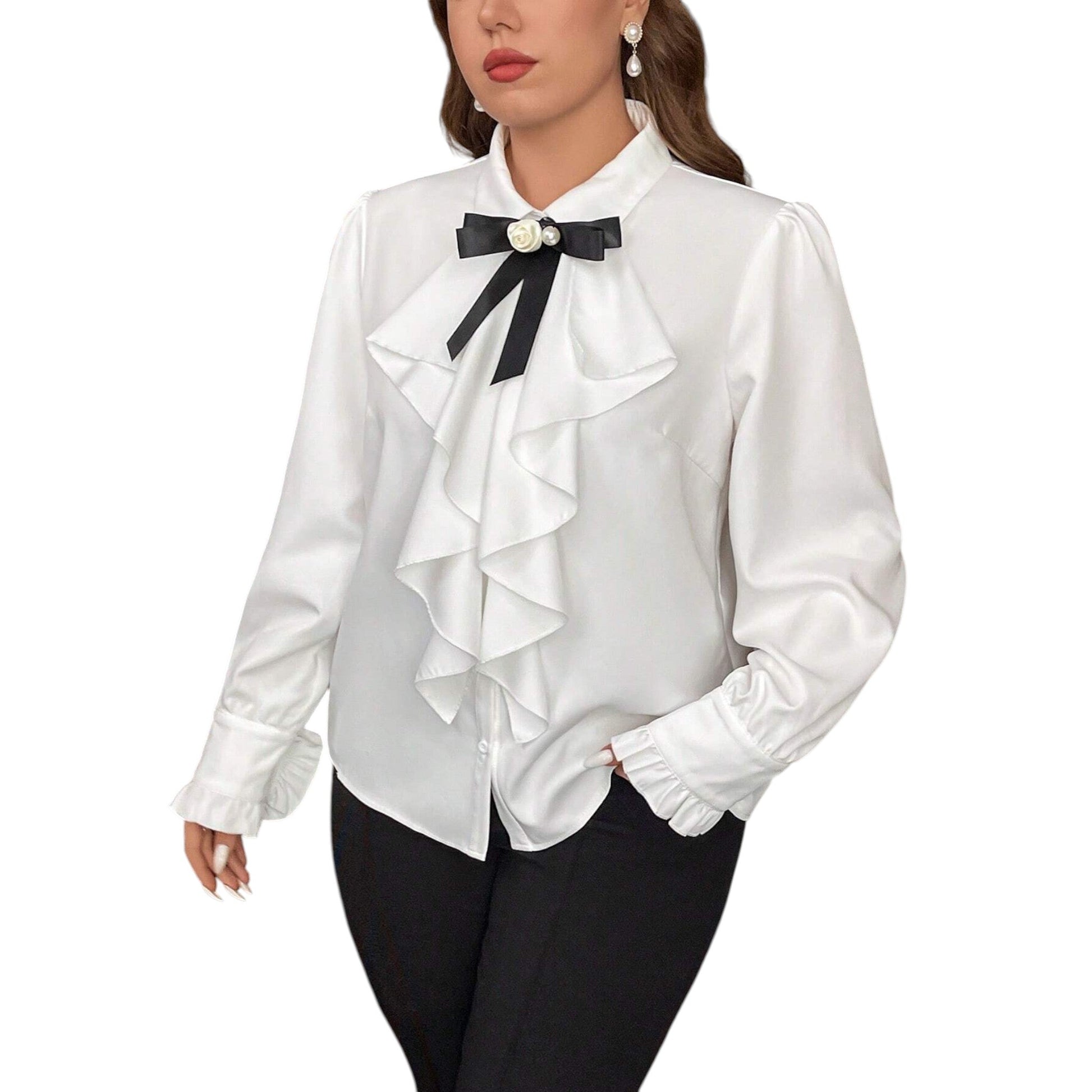 Címke nélküli, ekrü, galléros, gombos, hosszú ujjú, fodros előlappal, fekete masni és ekrü rózsa dísszel.